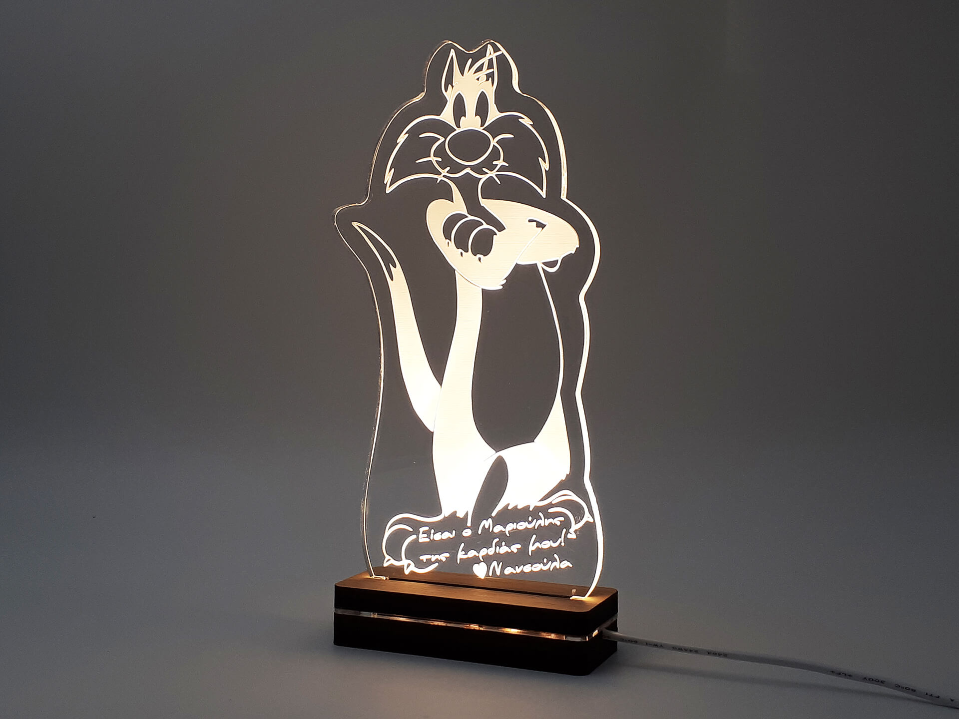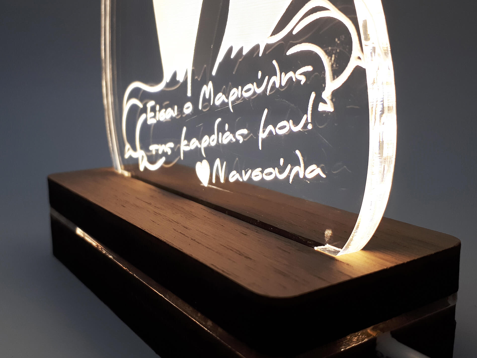 • Υλικά: Led λευκού χρώματος, Ακρυλικό διάφανο πάχους 6mm, Χειροποίητη βάση από ξύλο και ακρυλικό