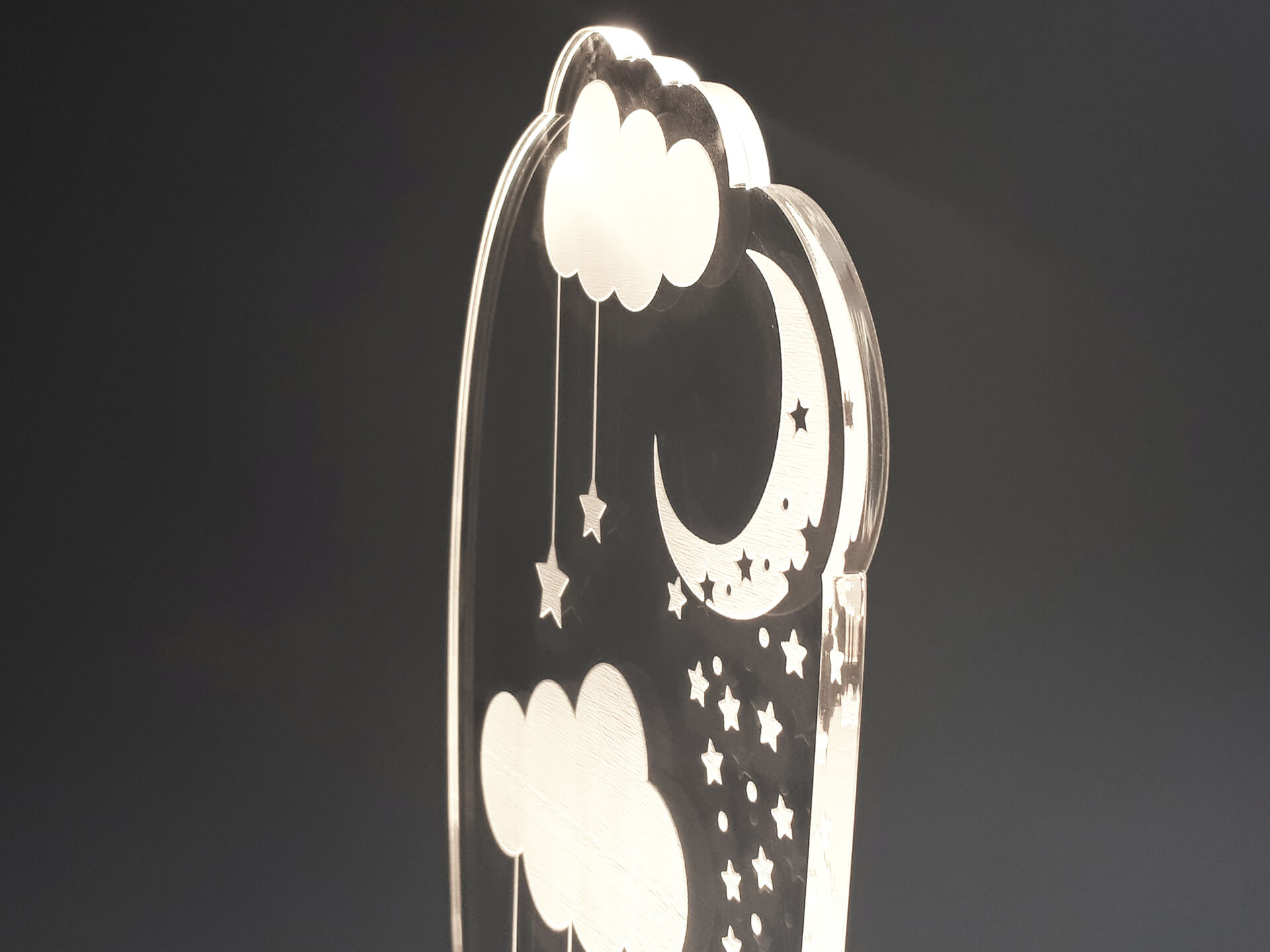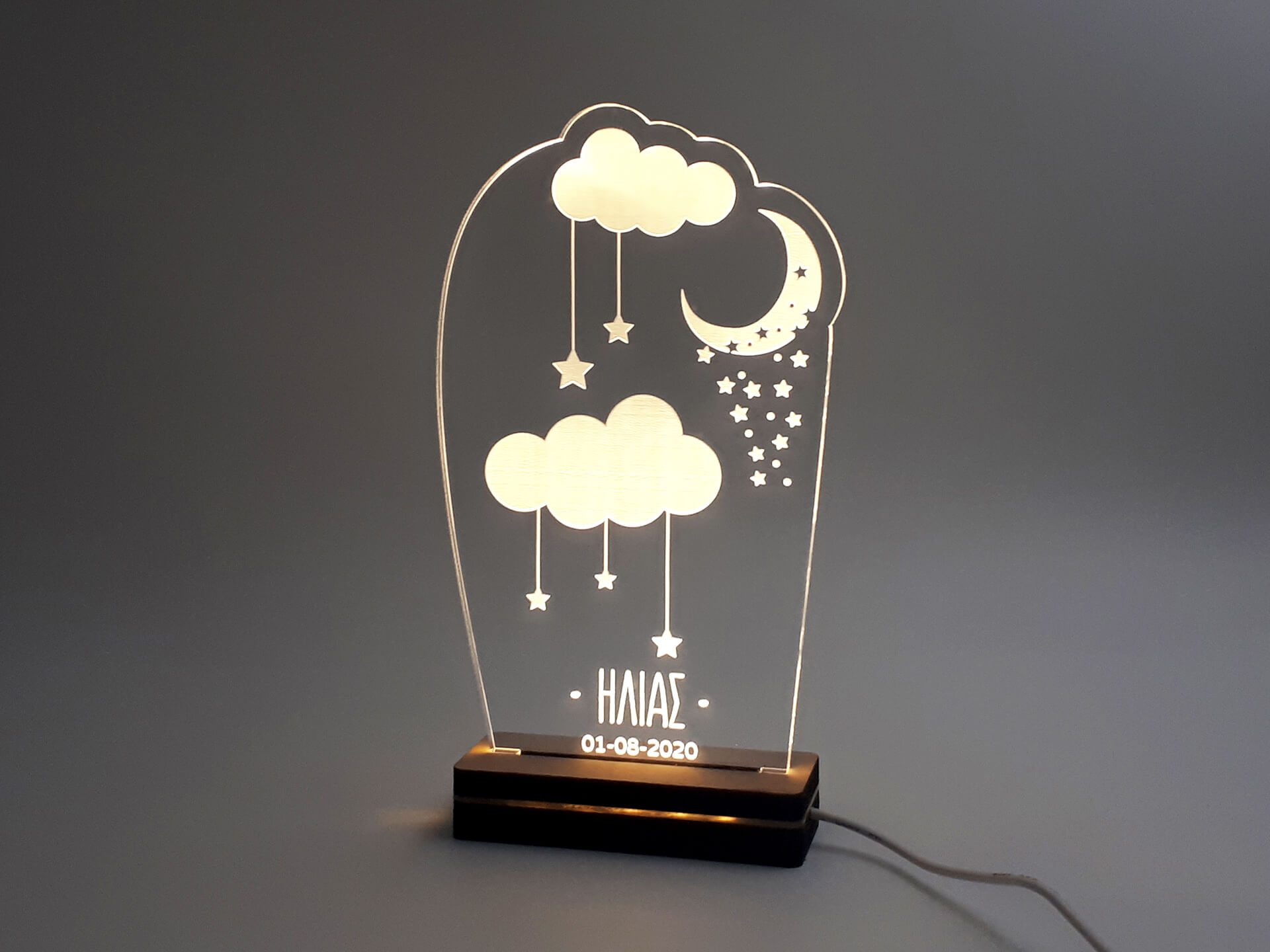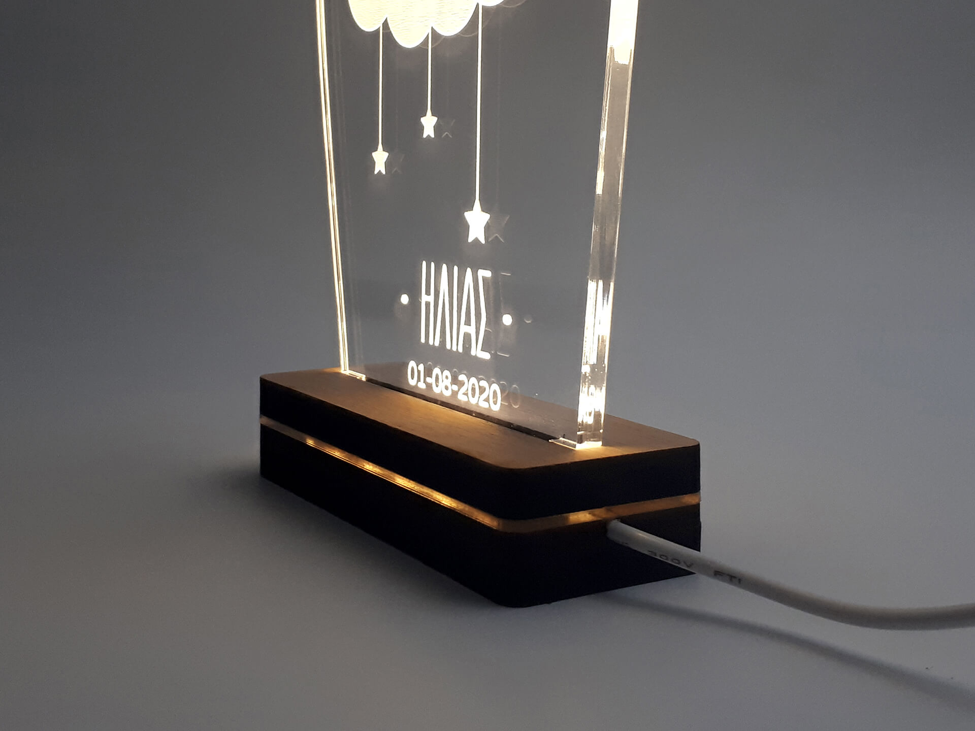 • Υλικά: Led λευκού χρώματος, Ακρυλικό διάφανο πάχους 6mm, Χειροποίητη βάση από ξύλο και ακρυλικό