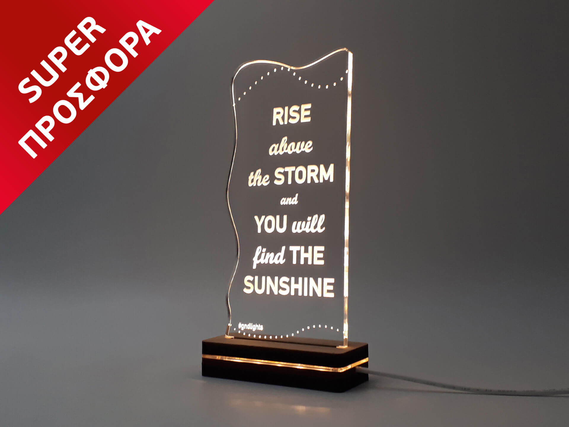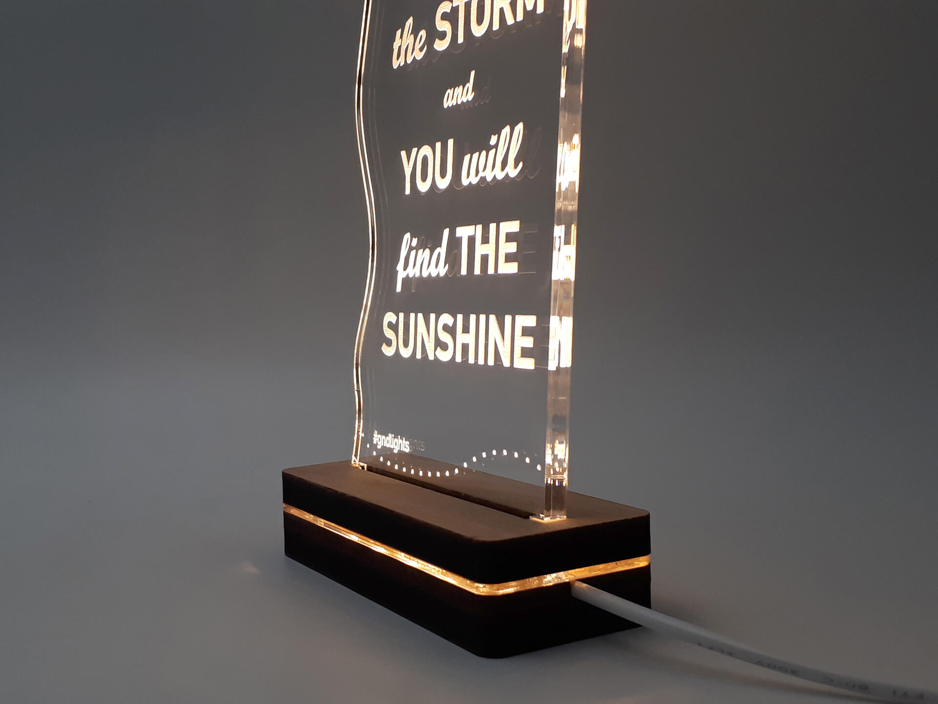 Φωτιστικό Led από ακρυλικό, με χάραξη τη φράση "Rise above the storm and you will find the sunshine" και ξύλινη χειροποίητη βάση δικής μας πρωτοποριακής σχεδίασης και κατασκευής.