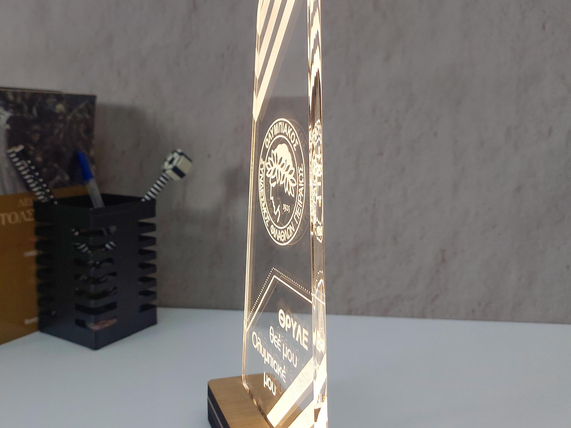 Φωτιστικό Led από ακρυλικό και ξύλινη χειροποίητη βάση δικής μας πρωτοποριακής σχεδίασης και κατασκευής.