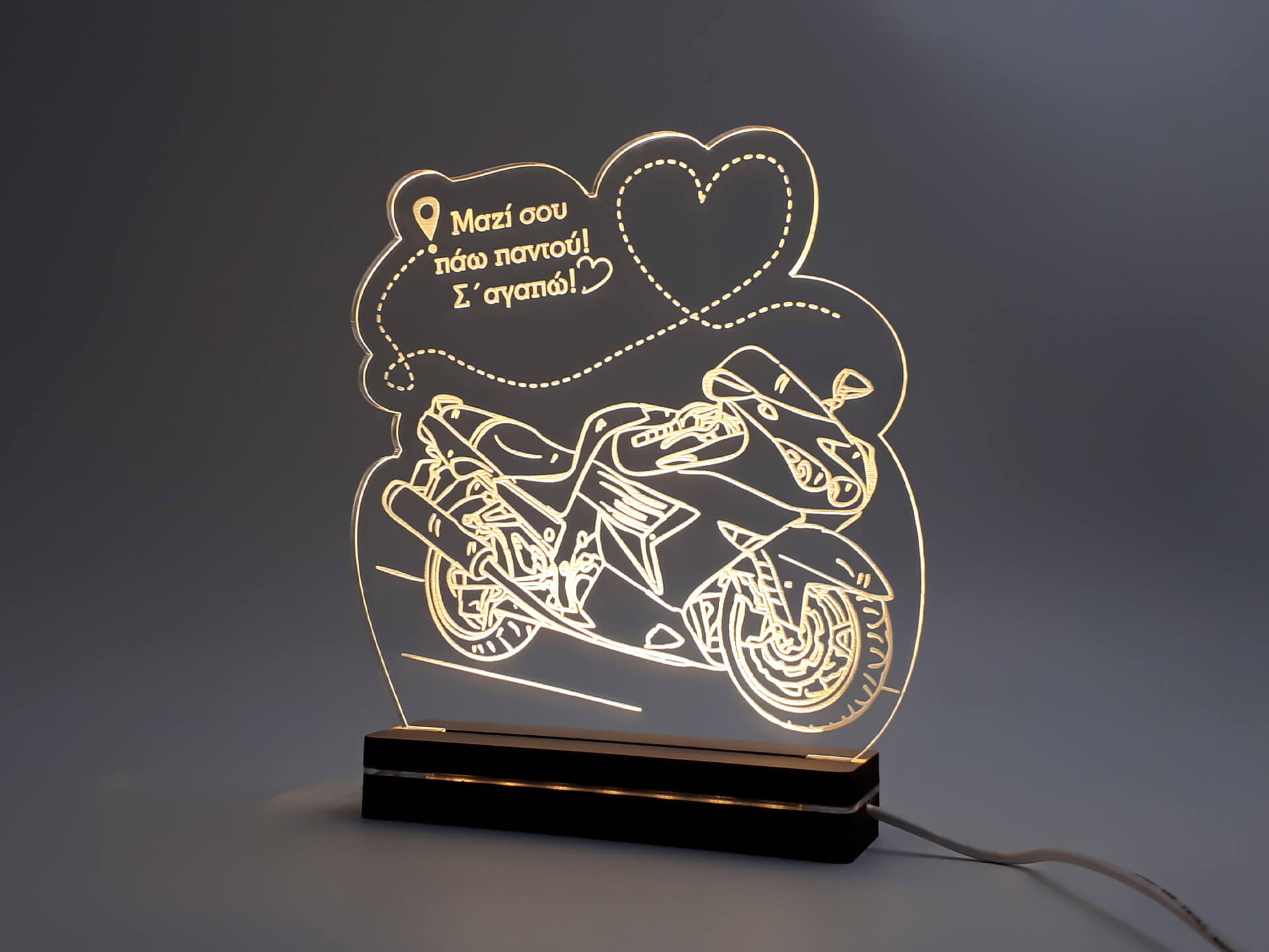 • Υλικά: Led λευκού χρώματος, Ακρυλικό διάφανο πάχους 6mm, Χειροποίητη βάση από ξύλο και ακρυλικό