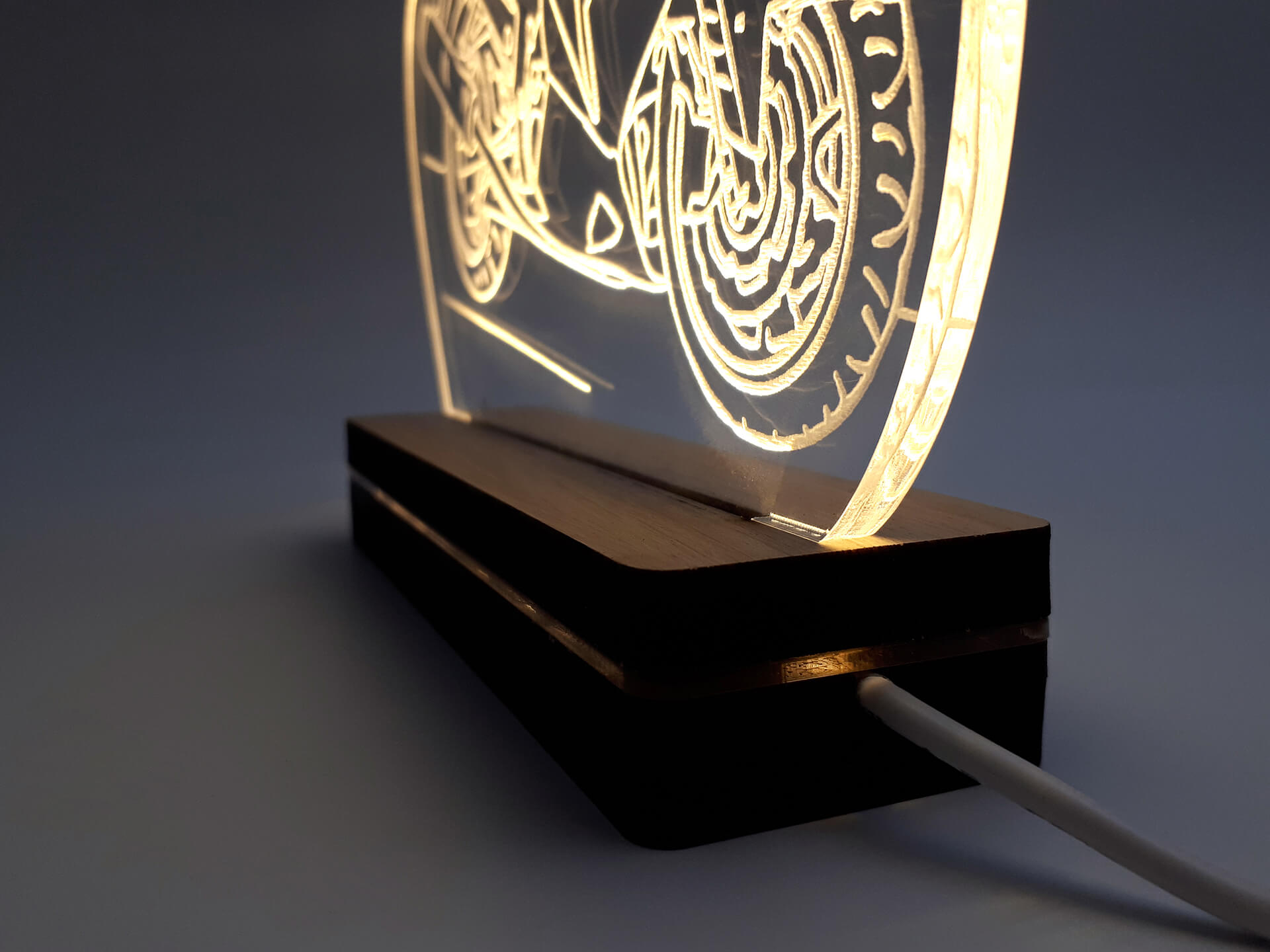 Φωτιστικό Led από ακρυλικό και ξύλινη χειροποίητη βάση δικής μας πρωτοποριακής σχεδίασης και κατασκευής.