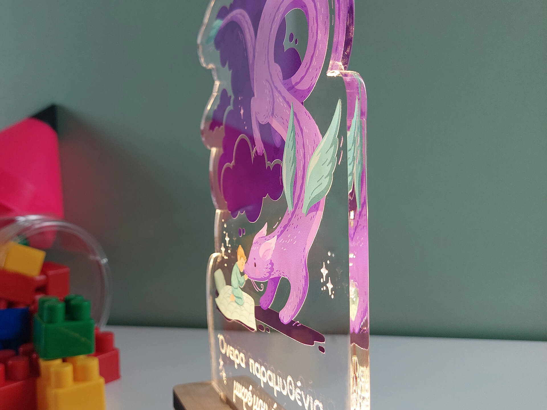 • Υλικά: Led λευκού χρώματος, Ακρυλικό διάφανο πάχους 6mm, Χειροποίητη βάση από ξύλο και ακρυλικό
