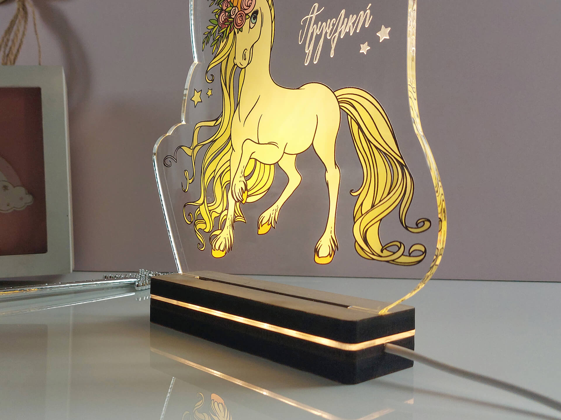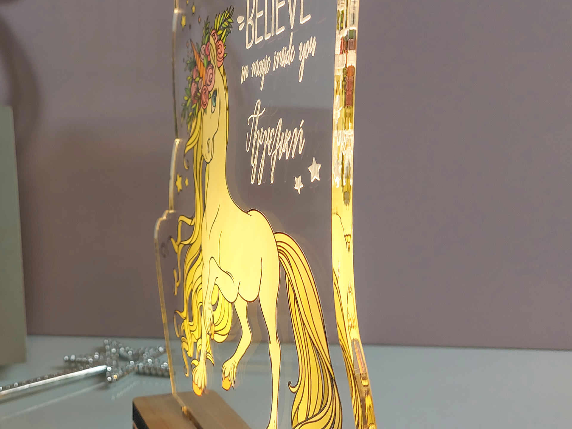 • Υλικά: Led λευκού χρώματος, Ακρυλικό διάφανο πάχους 6mm, Χειροποίητη βάση από ξύλο και ακρυλικό