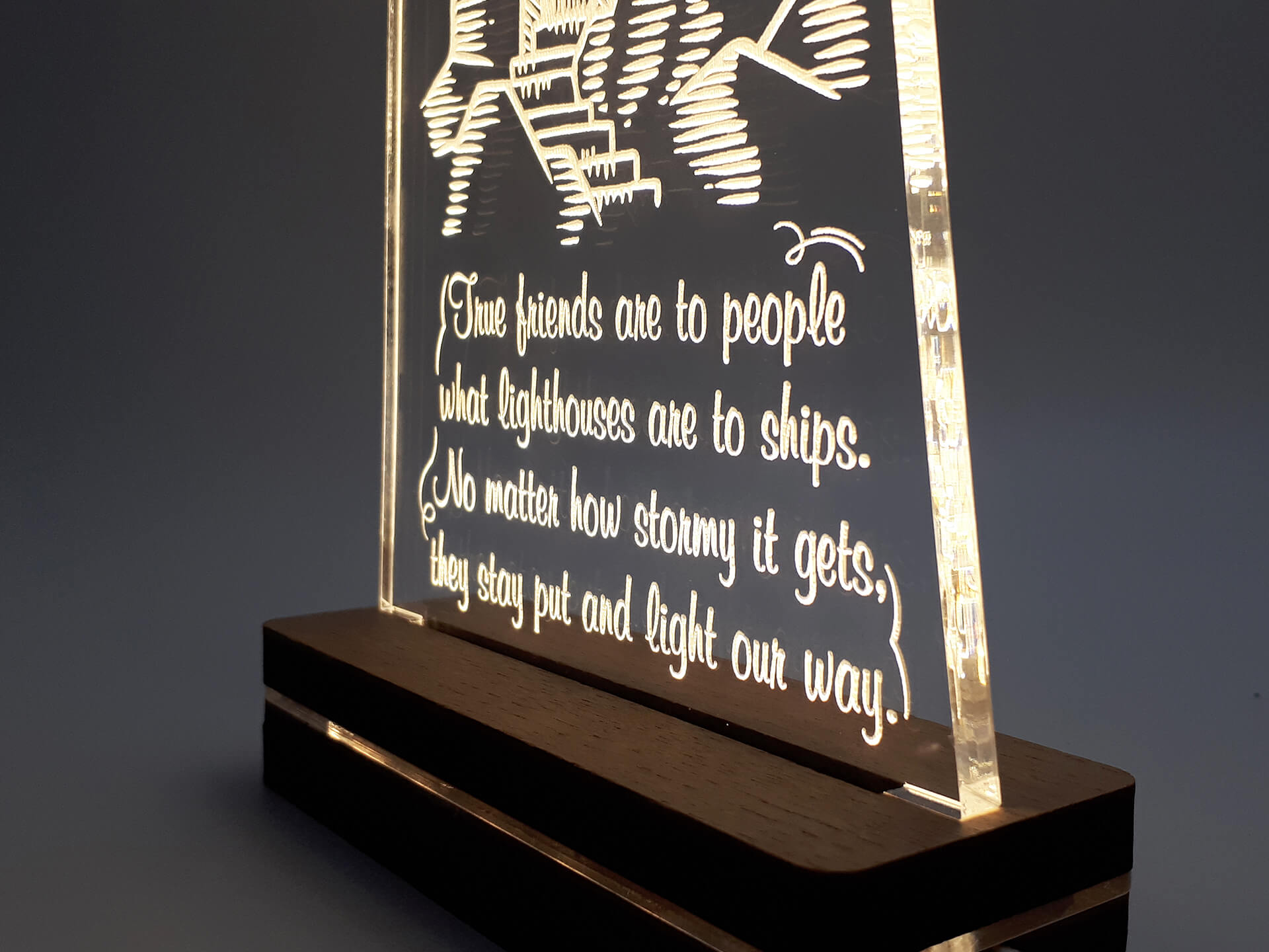 • Υλικά: Led λευκού χρώματος, Ακρυλικό διάφανο πάχους 6mm, Χειροποίητη βάση από ξύλο και ακρυλικό