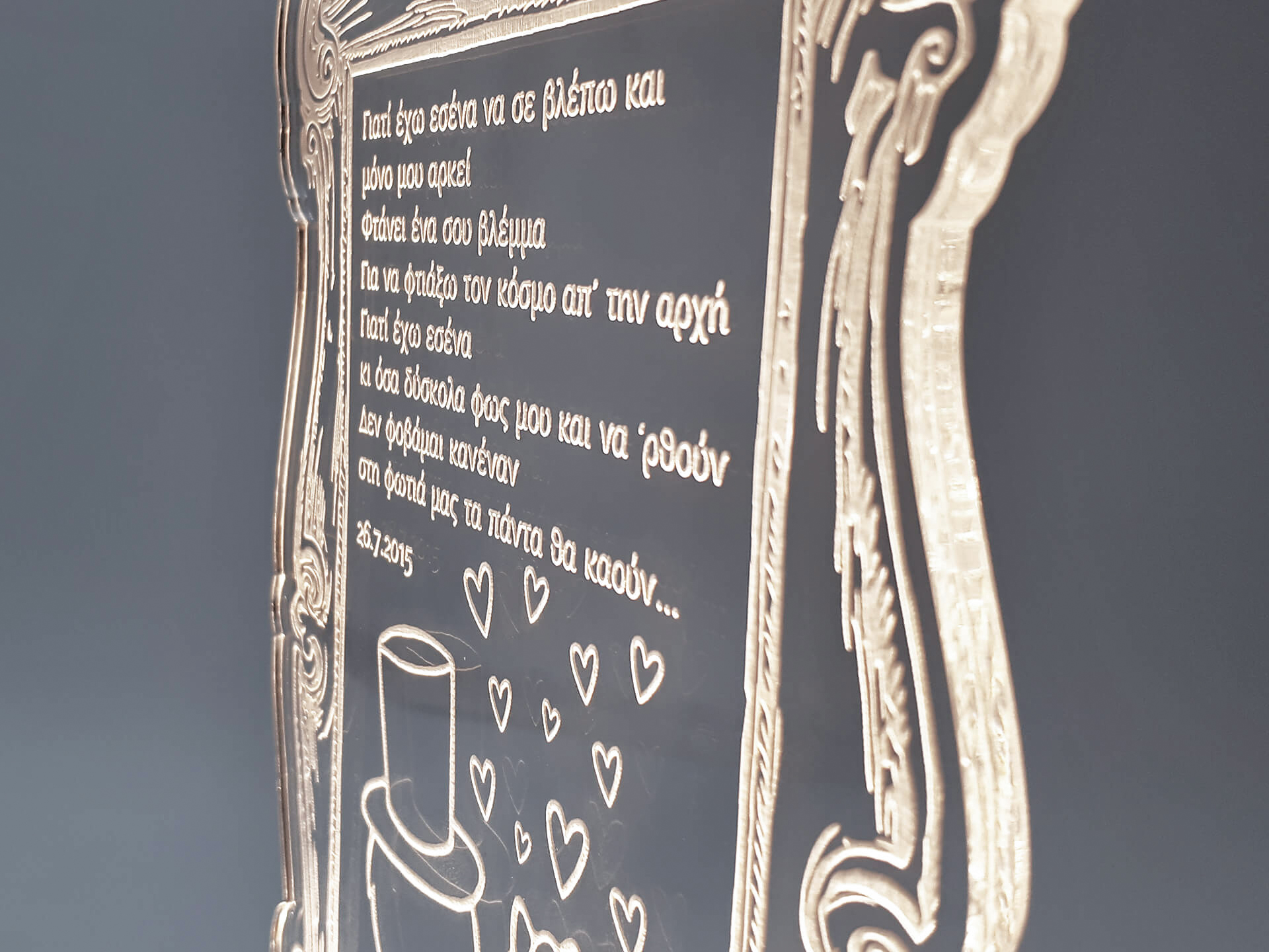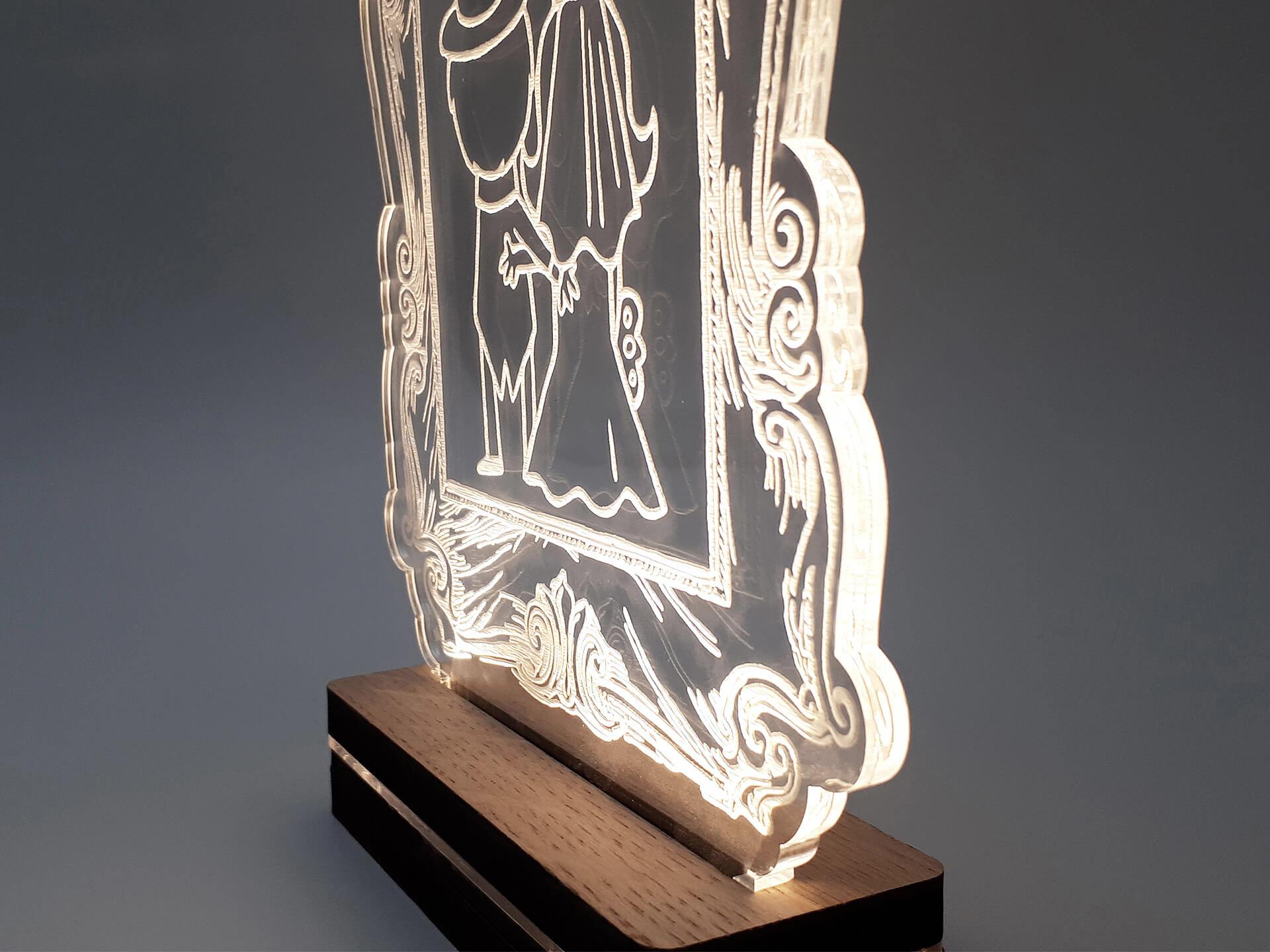 • Υλικά: Led λευκού χρώματος, Ακρυλικό διάφανο πάχους 6mm, Χειροποίητη βάση από ξύλο και ακρυλικό