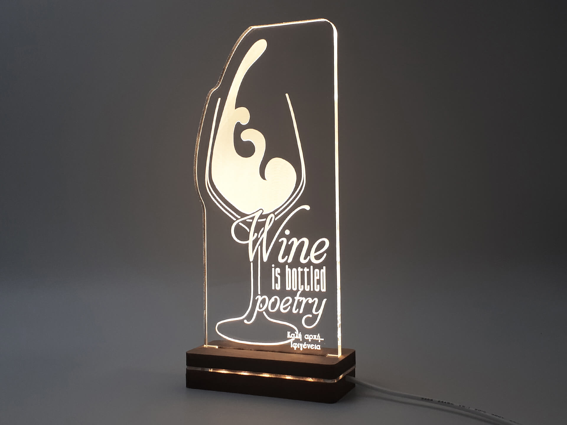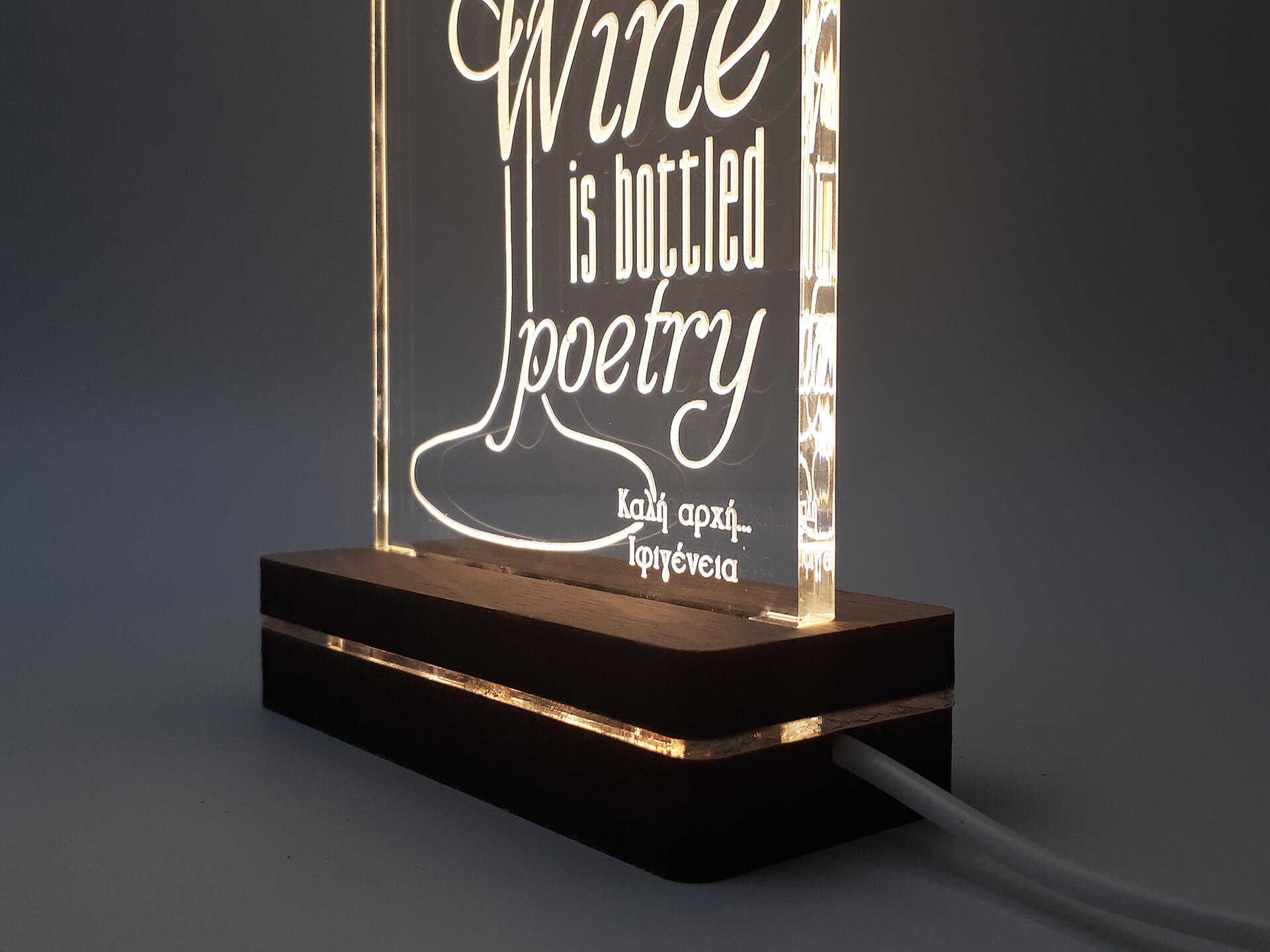 • Υλικά: Led λευκού χρώματος, Ακρυλικό διάφανο πάχους 6mm, Χειροποίητη βάση από ξύλο και ακρυλικό