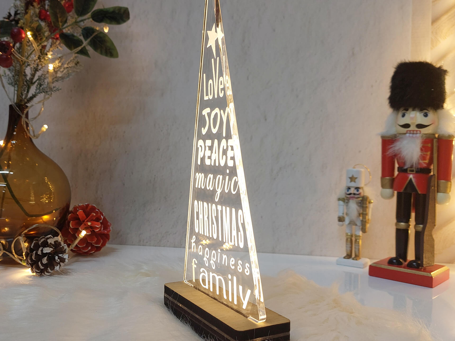 • Υλικά: Led λευκού χρώματος, Ακρυλικό διάφανο πάχους 6mm, Χειροποίητη βάση από ξύλο και ακρυλικό
