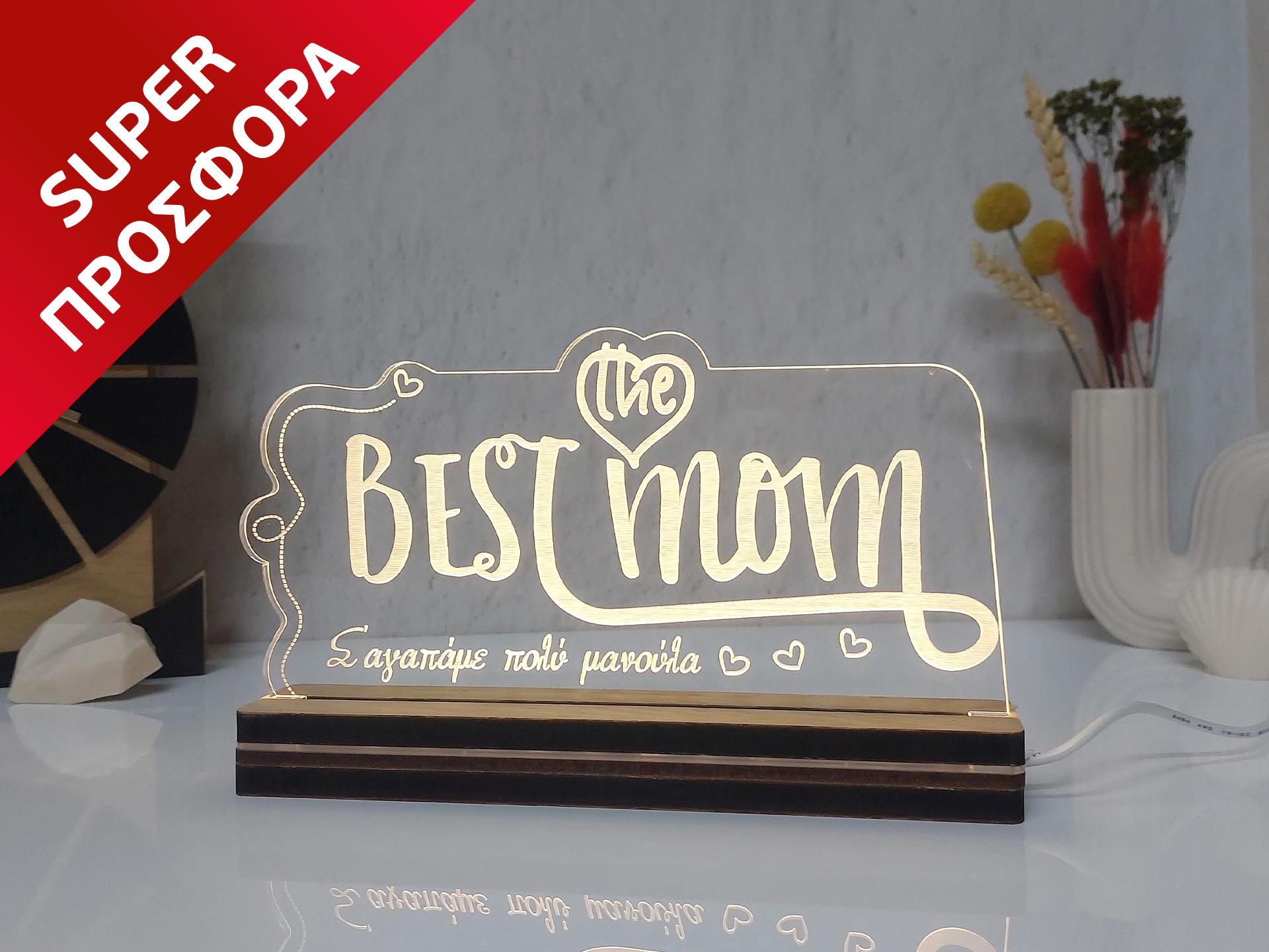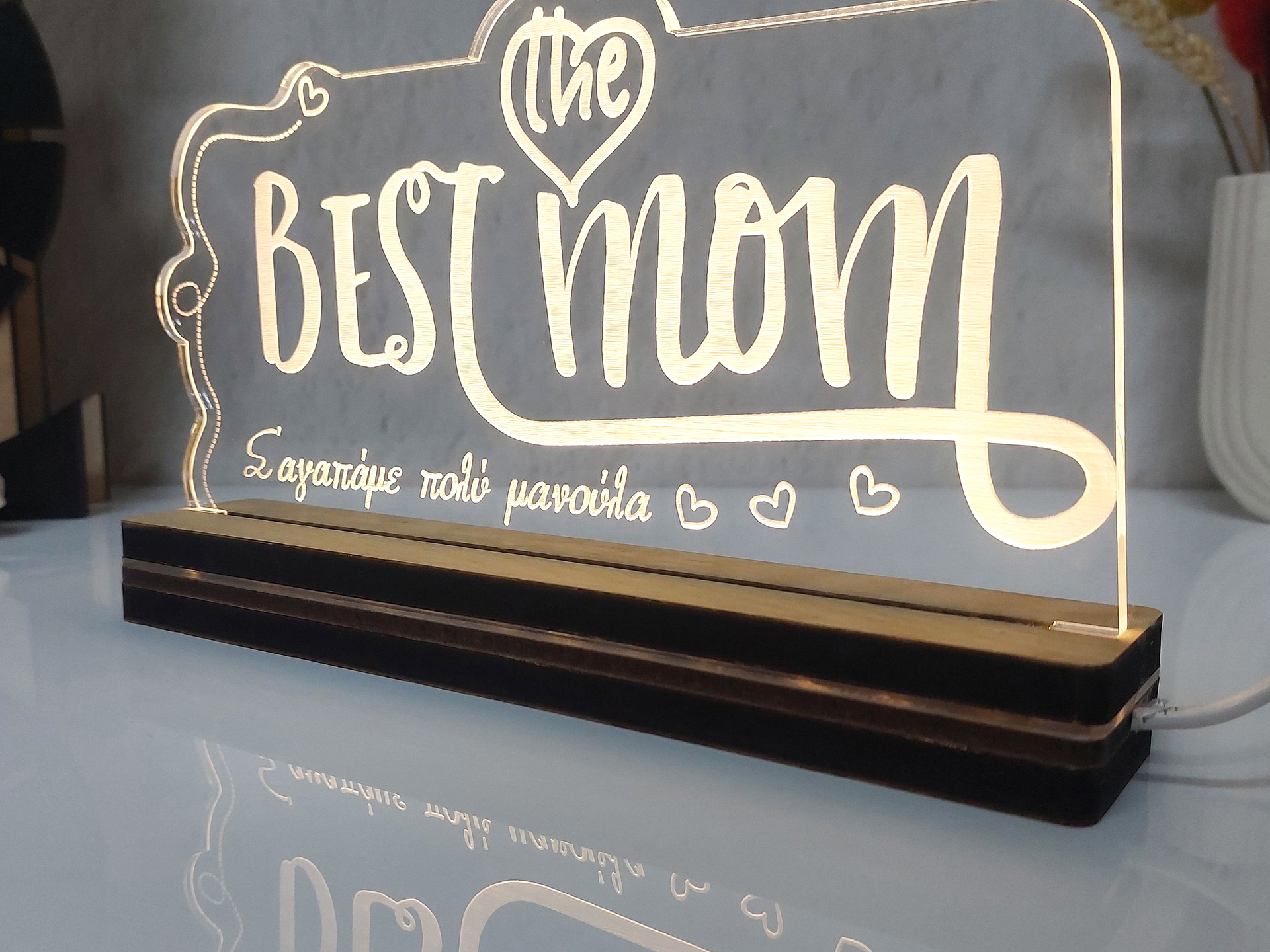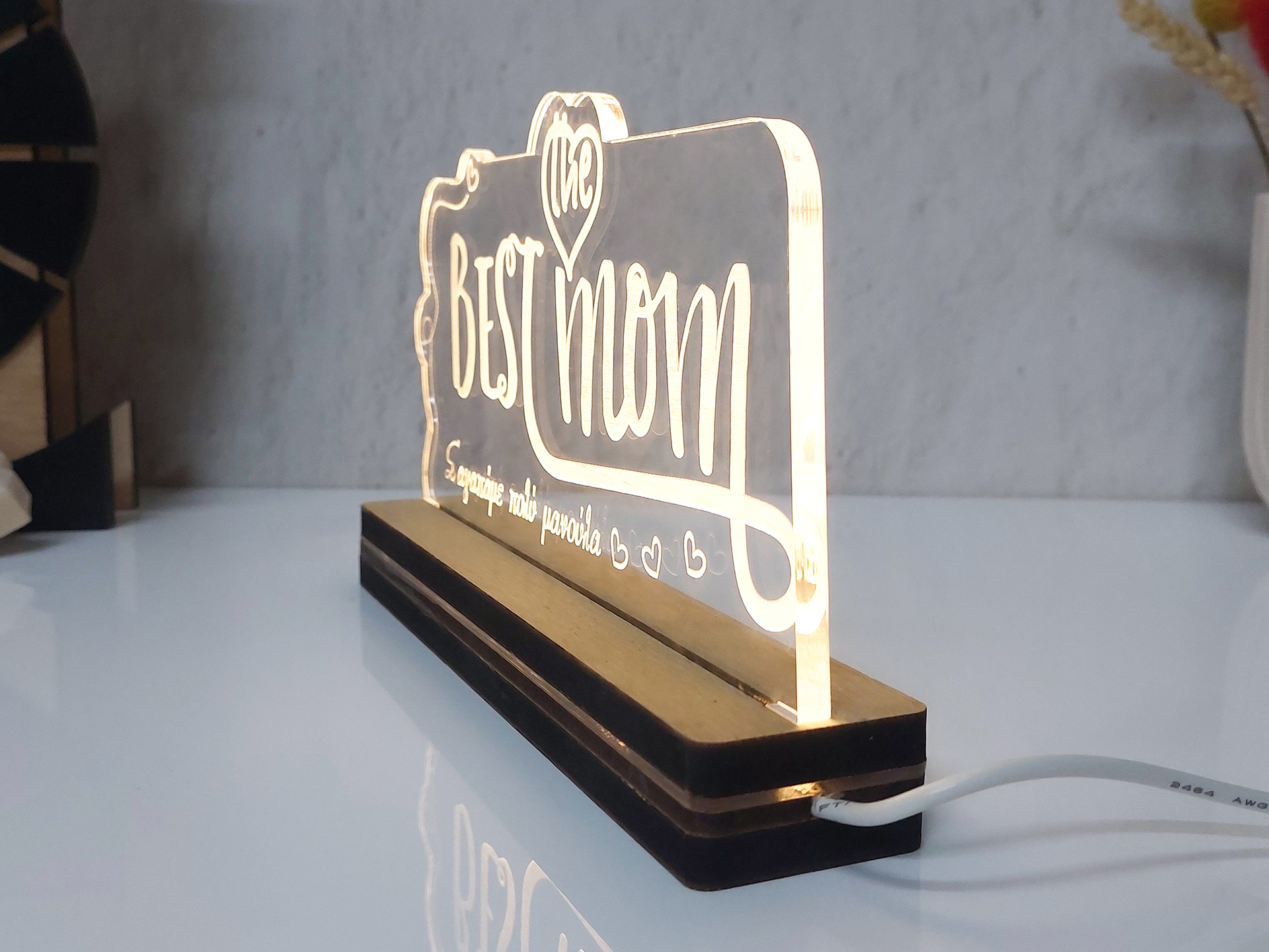 • Υλικά: Led λευκού χρώματος, Ακρυλικό διάφανο πάχους 6mm, Χειροποίητη βάση από ξύλο και ακρυλικό