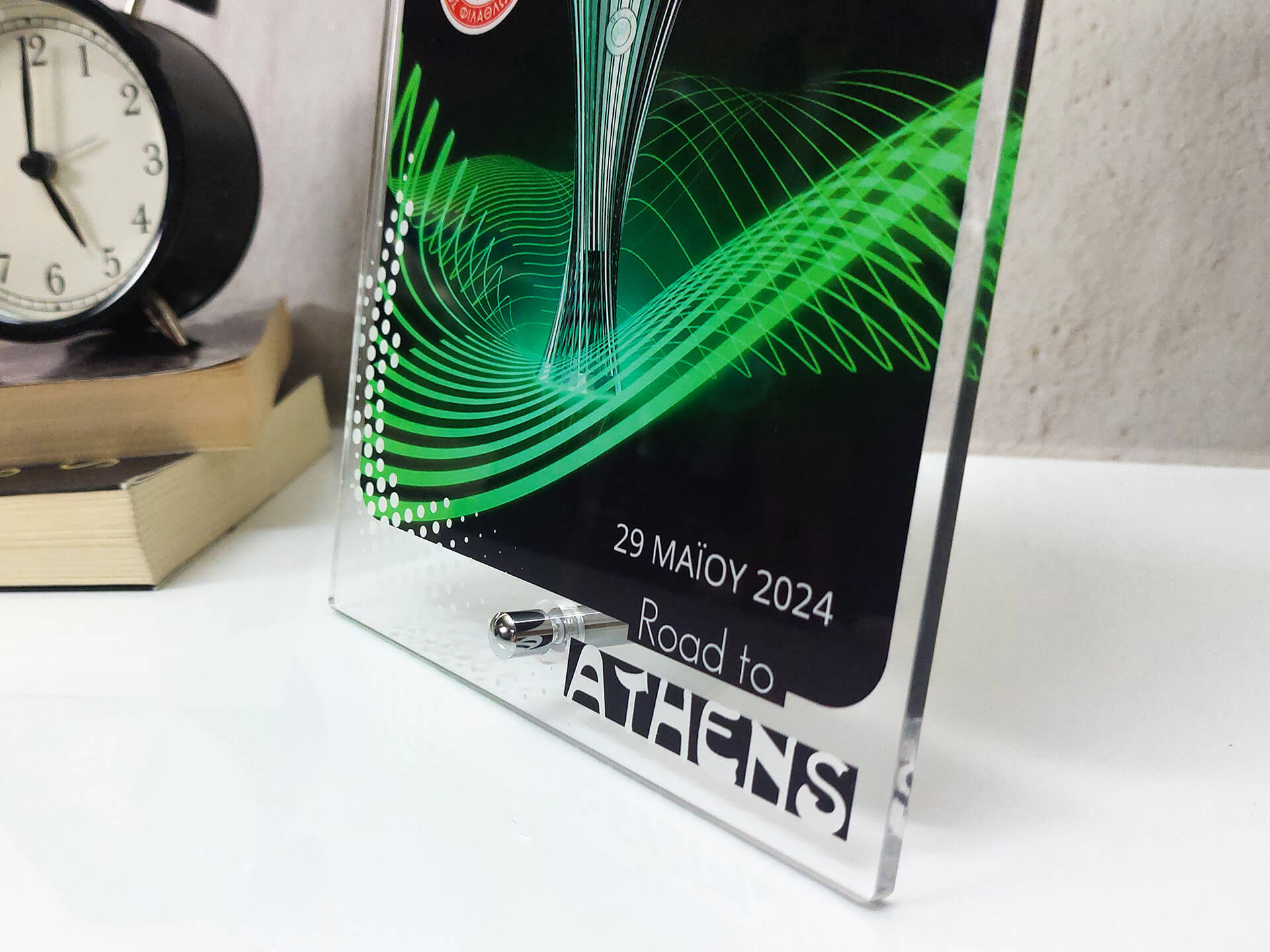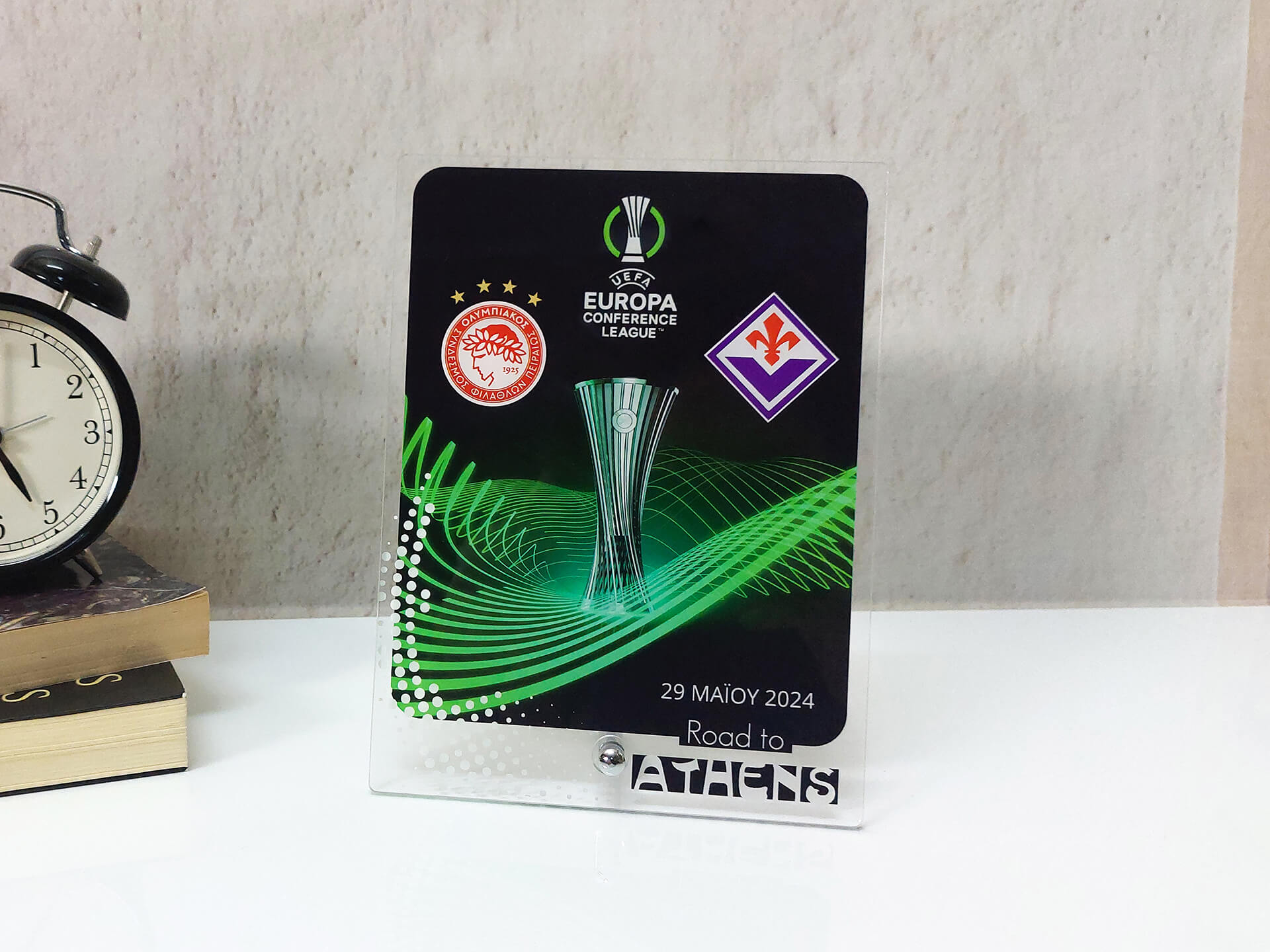 Επιτραπέζια κορνίζα με θέμα την πρόκριση του Ολυμπιακού στον τελικό του Conference League.