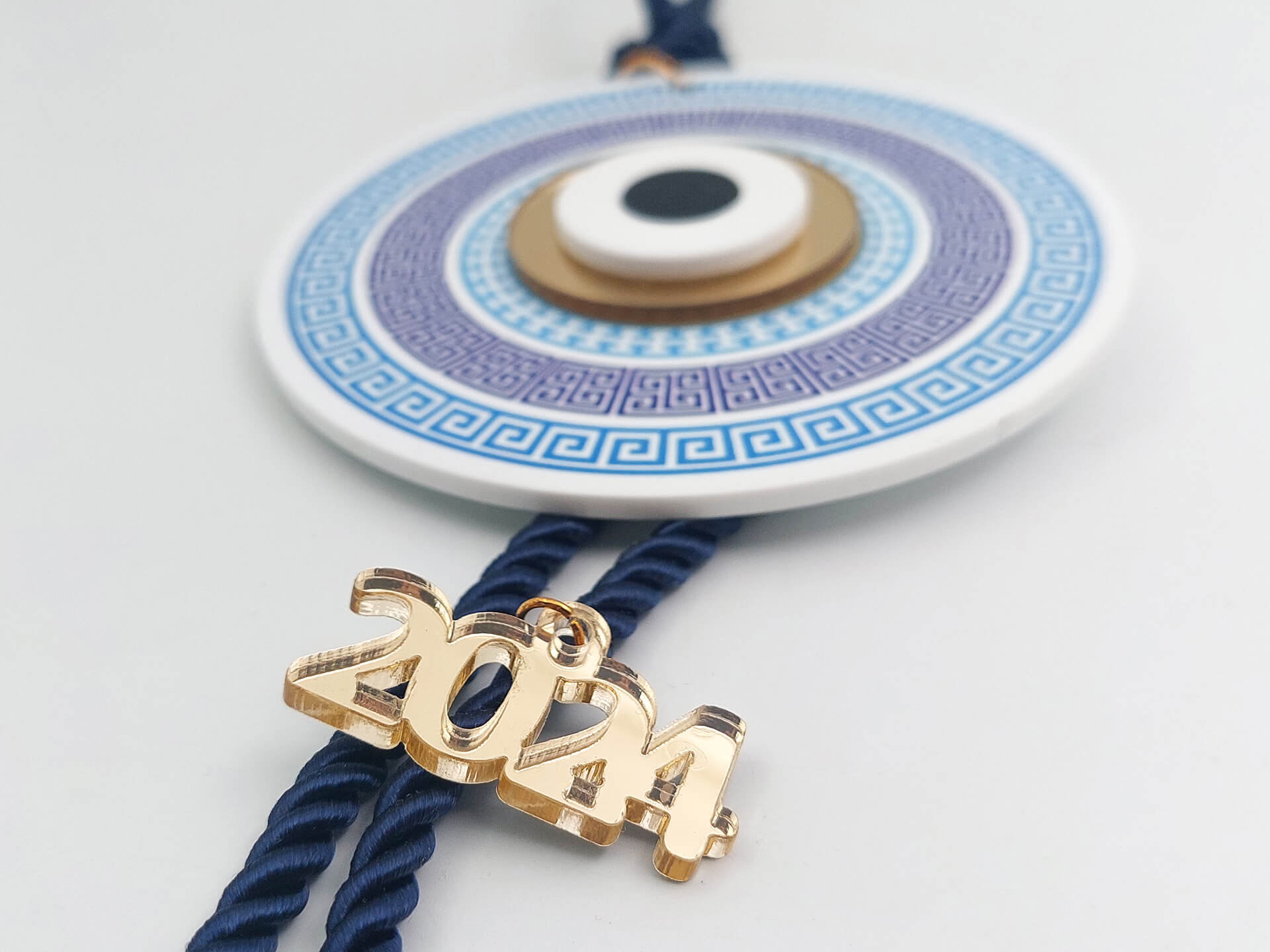 • Υλικά: Χονδρό κορδόνι με διπλή φούντα, ακρυλικό στοιχείο με εκτύπωση και διακοσμητικό από ακρυλικό (plexiglass) καθρέπτης χρυσό
