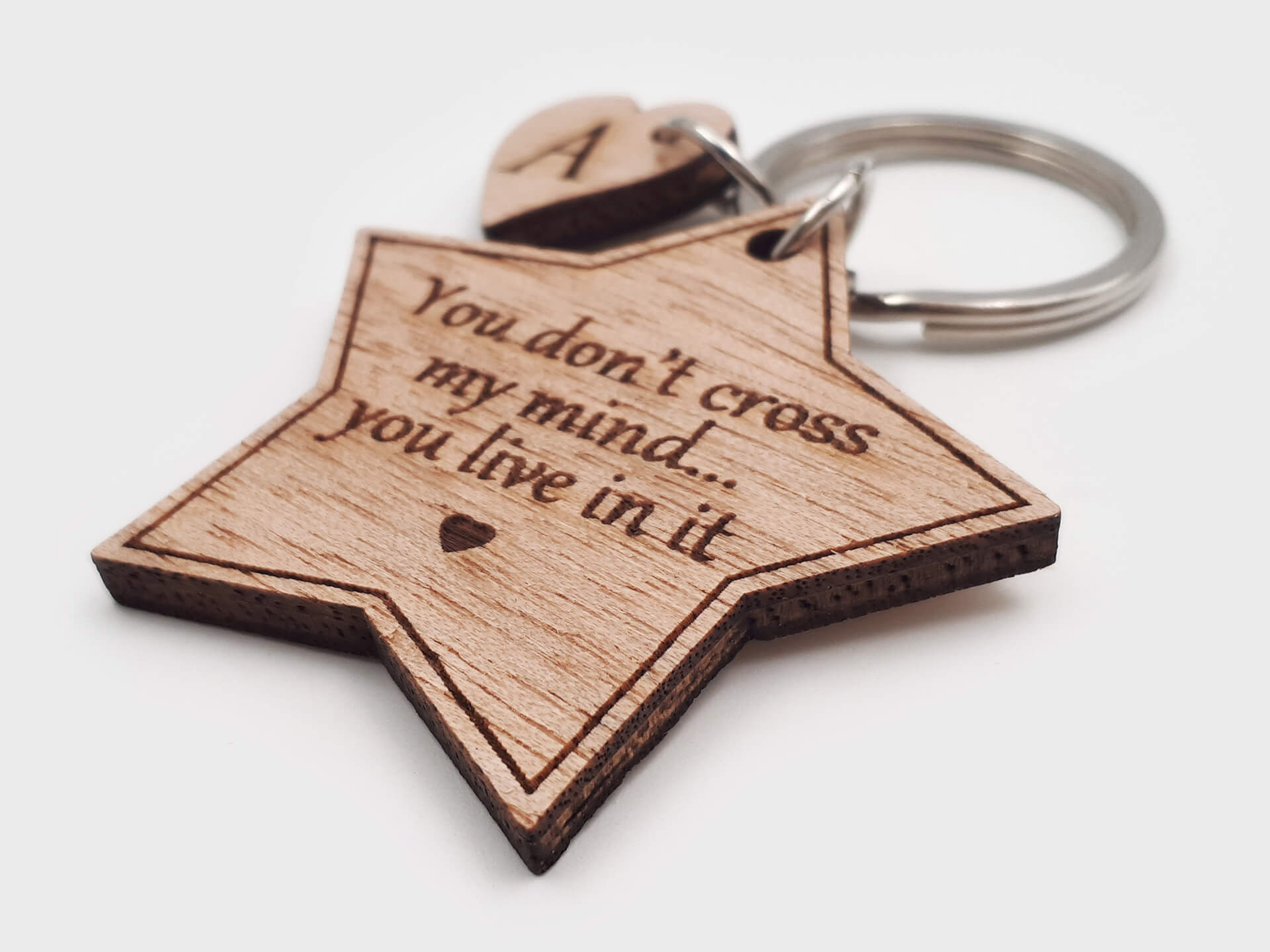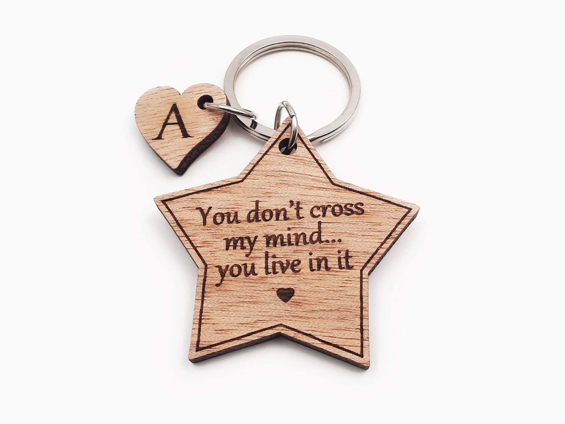 Ιδιαίτερο ξύλινο μπρελόκ σε σχήμα αστεριού με χάραξη τη φράση "You don't cross my mind... you live in it"