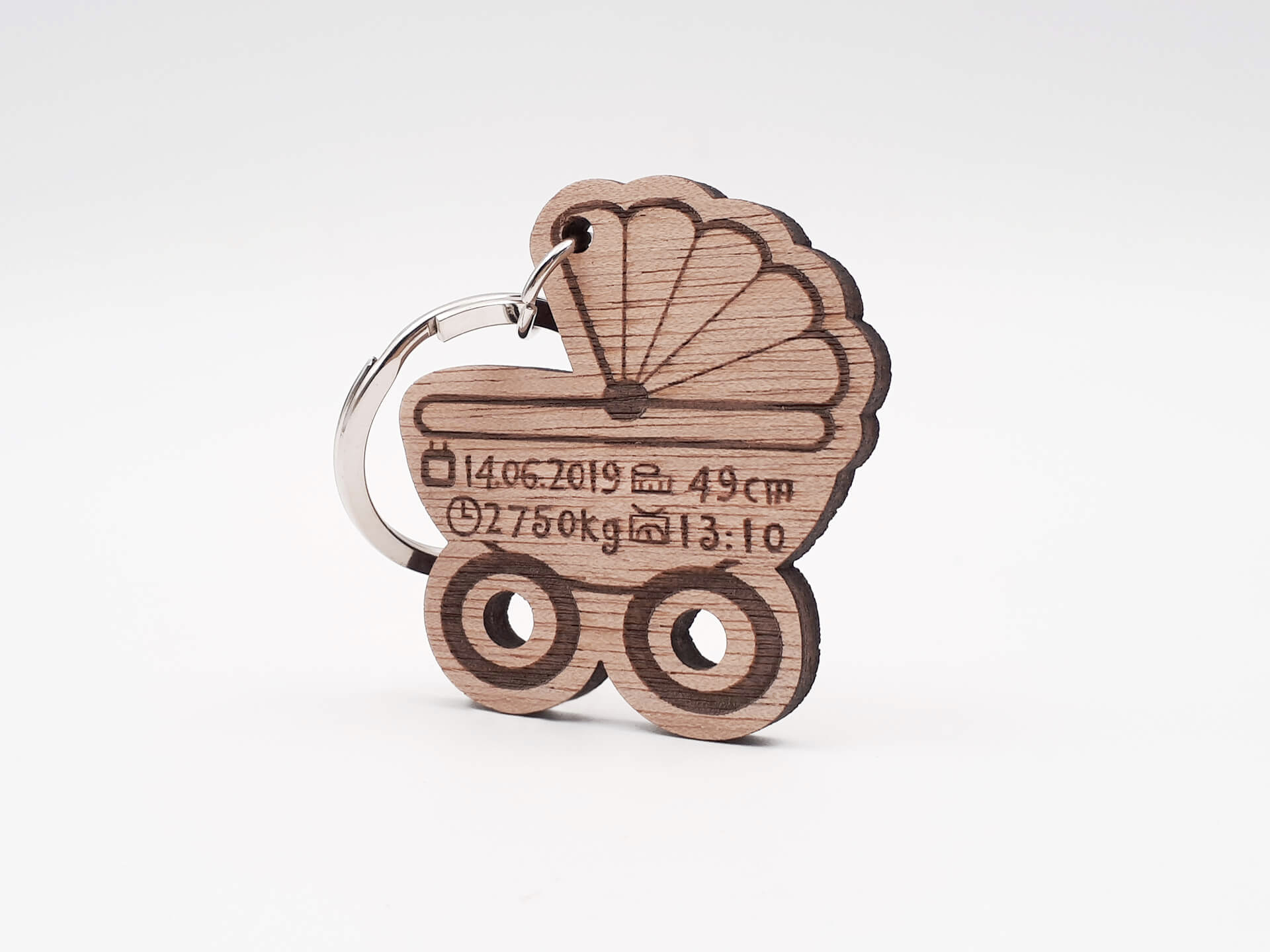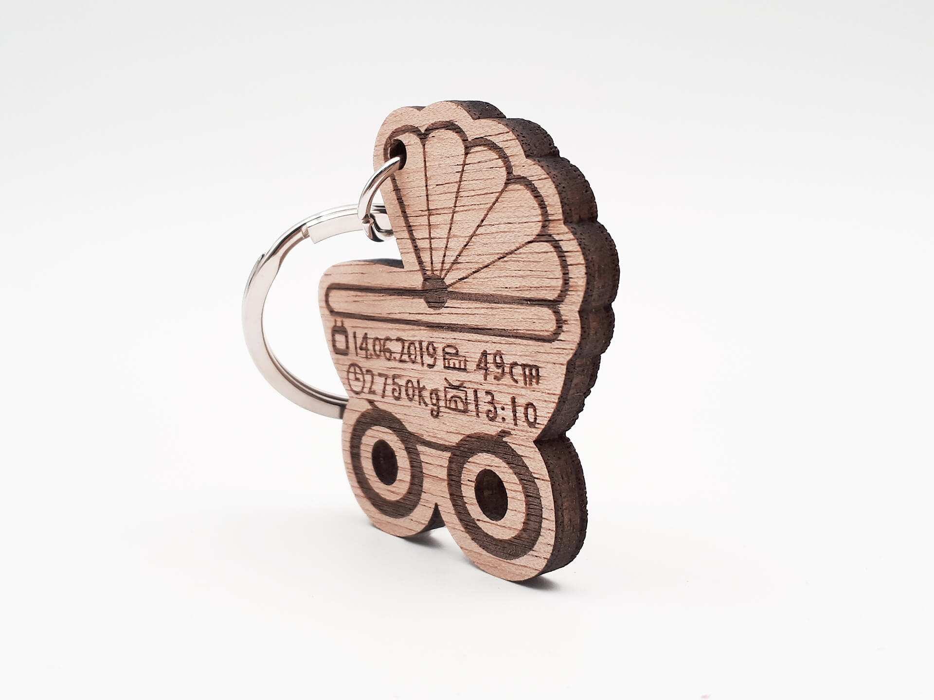 Ξύλινο μπρελόκ καροτσάκι, για να σηματοδοτήσετε την άφιξη του νέου μέλους στην οικογένεια! Ένα πρωτότυπο σχέδιο για να χαράξετε το όνομα και την ημερομηνία γέννησης του μωρού σας και να τα έχετε πάντα μαζί σας, ή μπορείτε να το κάνετε δώρο σε νέους γονείς με τον ερχομό του νέου μέλους!