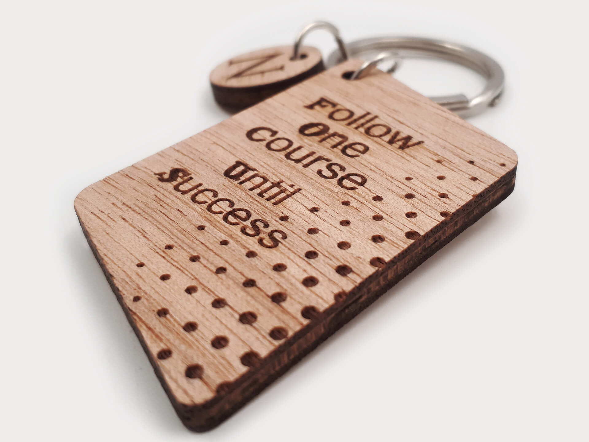 Ιδιαίτερο ξύλινο μπρελόκ σε σχήμα πλάγιο παραλληλόγραμμο με χάραξη τη φράση "Follow one course until success"