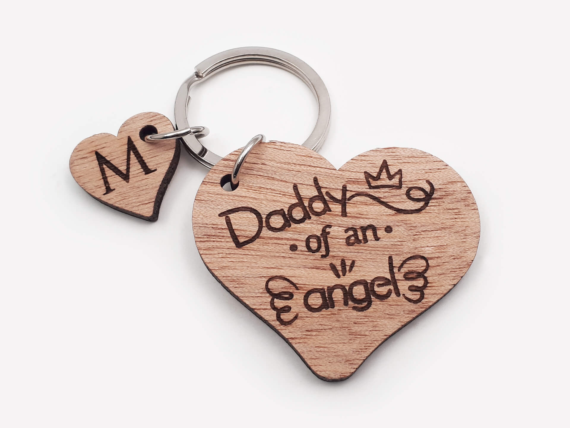 Ξύλινο μπρελόκ σε σχήμα καρδιά. Ένα πρωτότυπο σχέδιο για να δηλώσετε ότι είστε ο μπαμπάς ενός αγγελουδιού, ή μπορείτε να το κάνετε δώρο σε νέους γονείς!