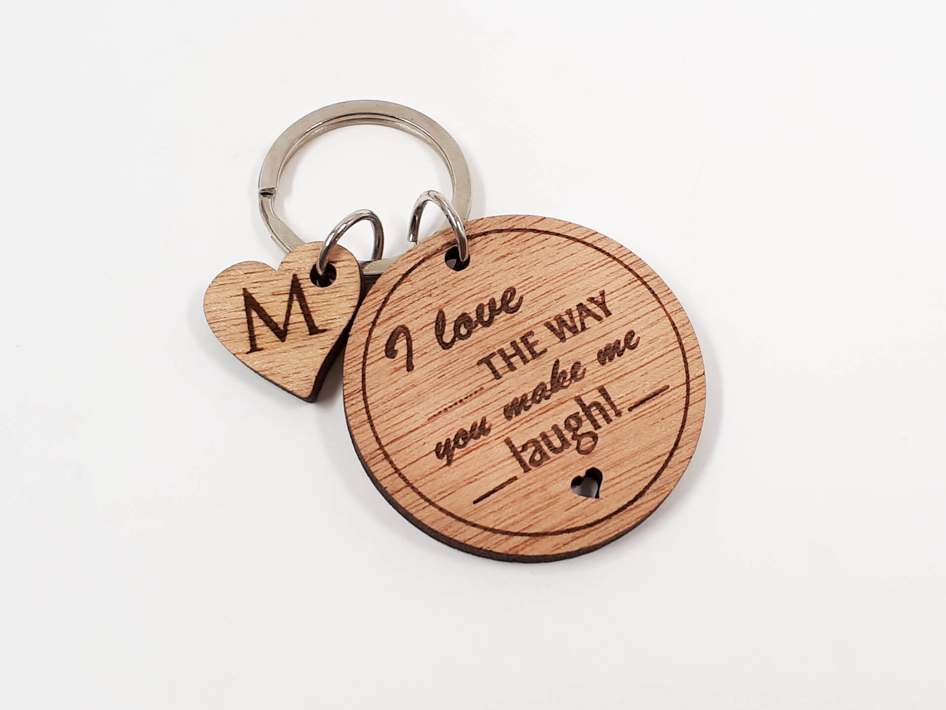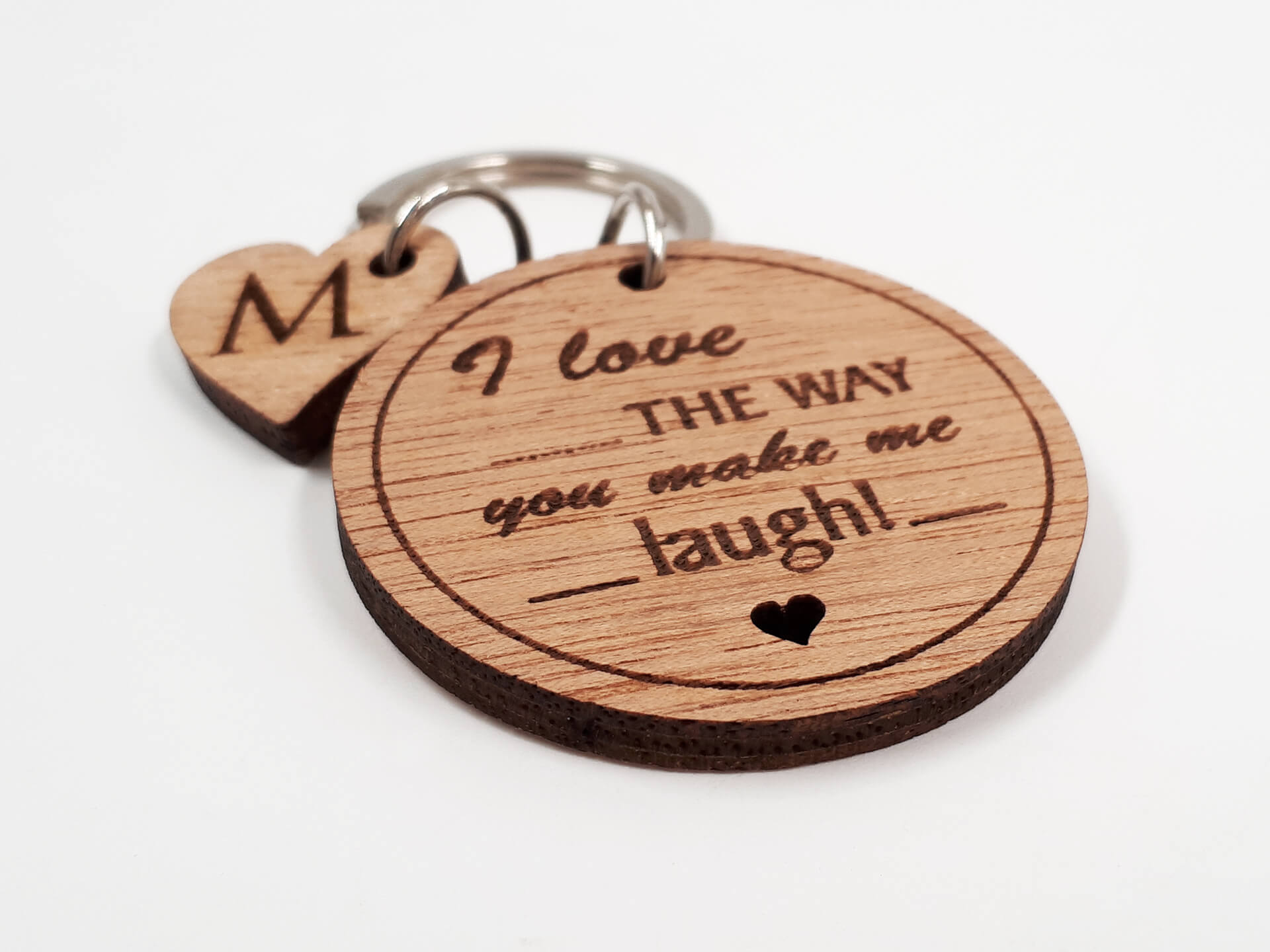 Πρωτότυπο ξύλινο μπρελόκ με τη πρόταση "I love the way you make me laugh"