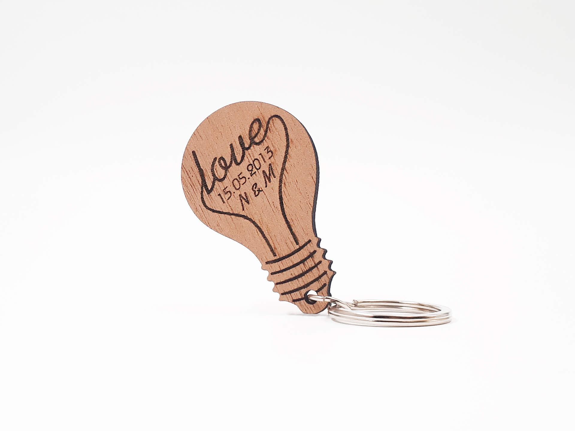 Πρωτότυπο ξύλινο μπρελόκ σε σχήμα λάμπας με χάραξη των δικών σας ονομάτων και ημερομηνίας.