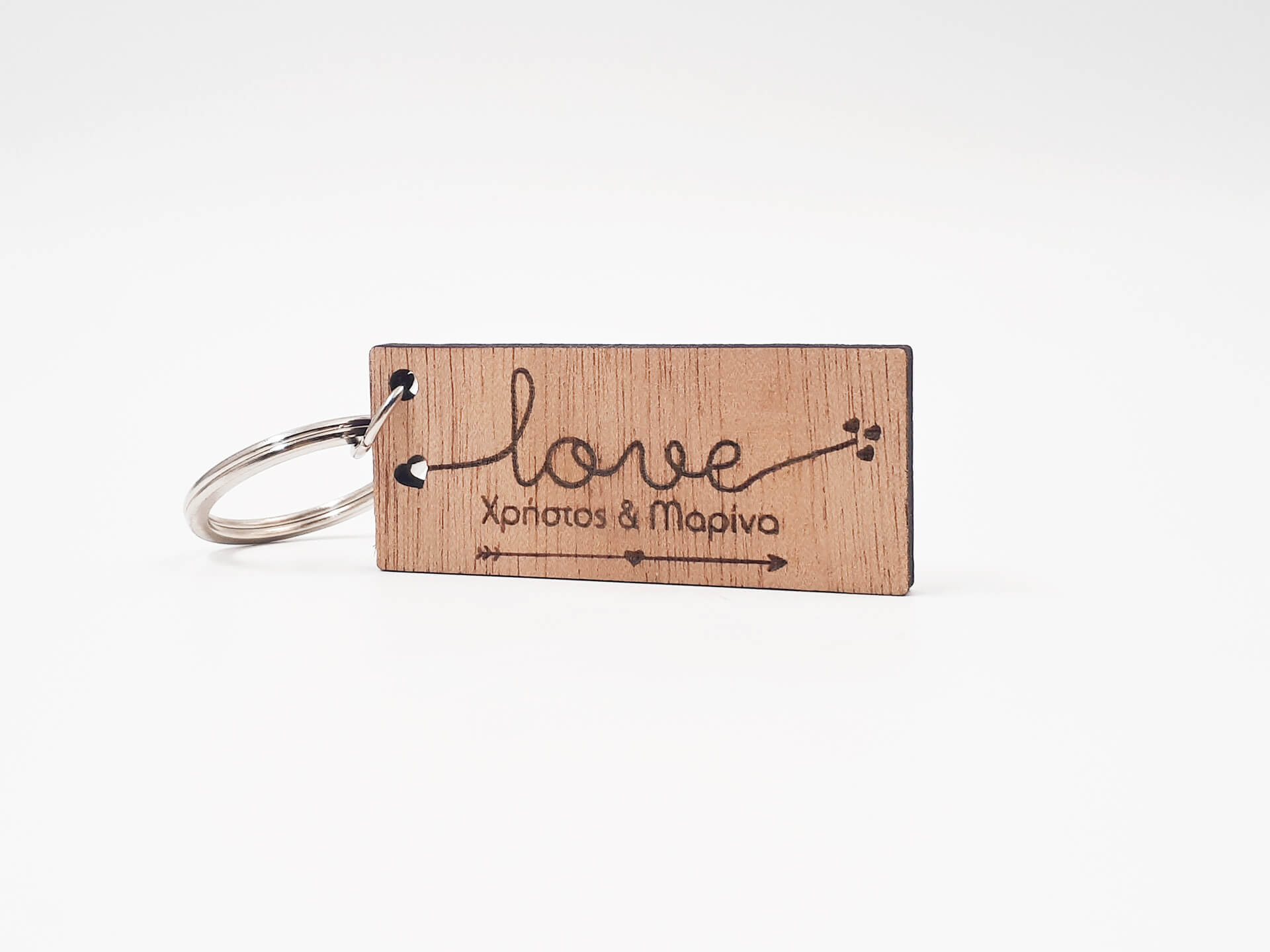 Πρωτότυπο ξύλινο μπρελόκ σε χάραξη Love και των ονομάτων σας. Δείξτε την αγάπη σας στο πιο αγαπημένο σας πρόσωπο.