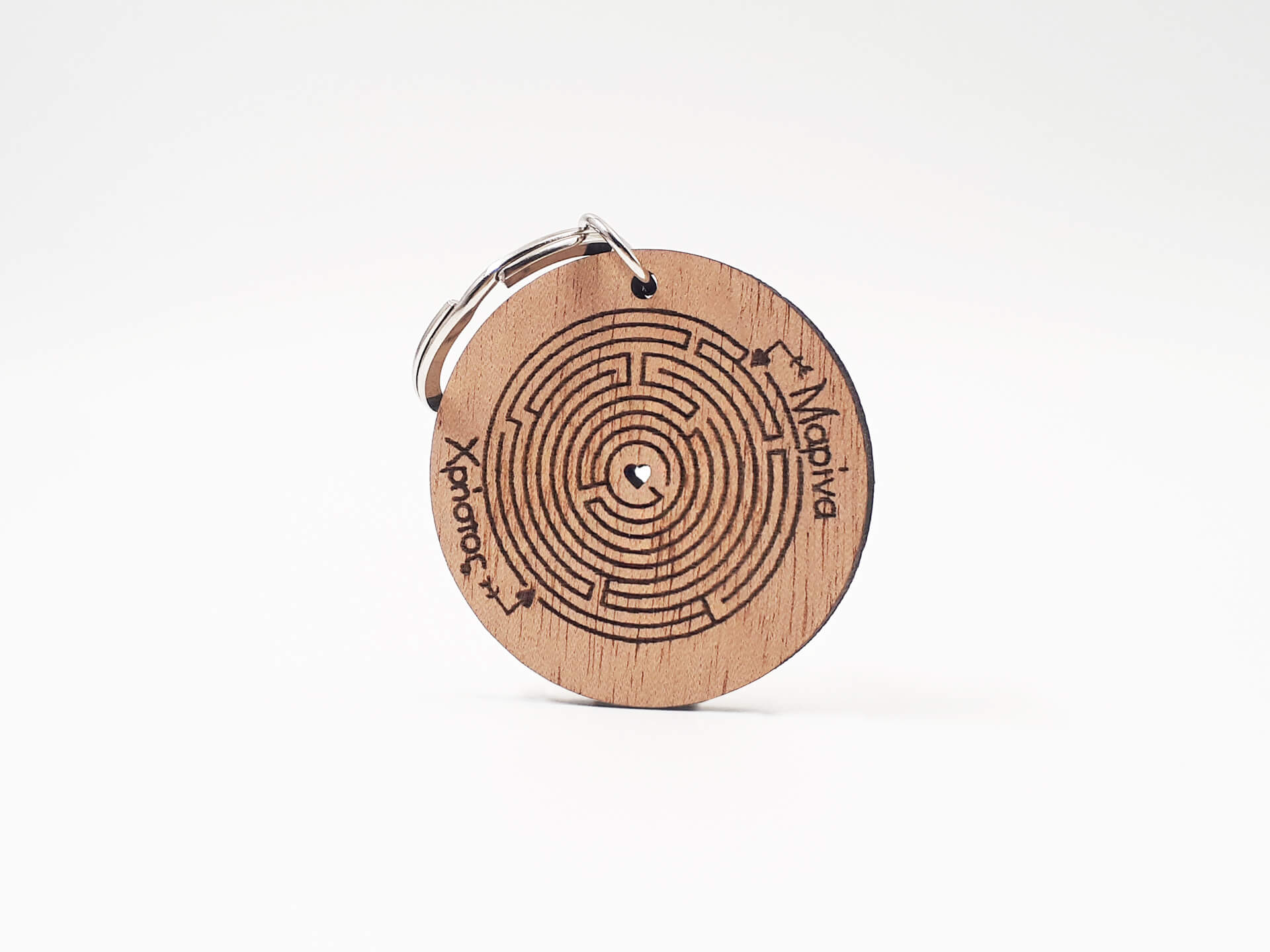 Πρωτότυπο ξύλινο μπρελόκ σε στρογγυλό σχήμα με χάραξη λαβύρινθος και επιλογή χάραξης των ονομάτων σας.