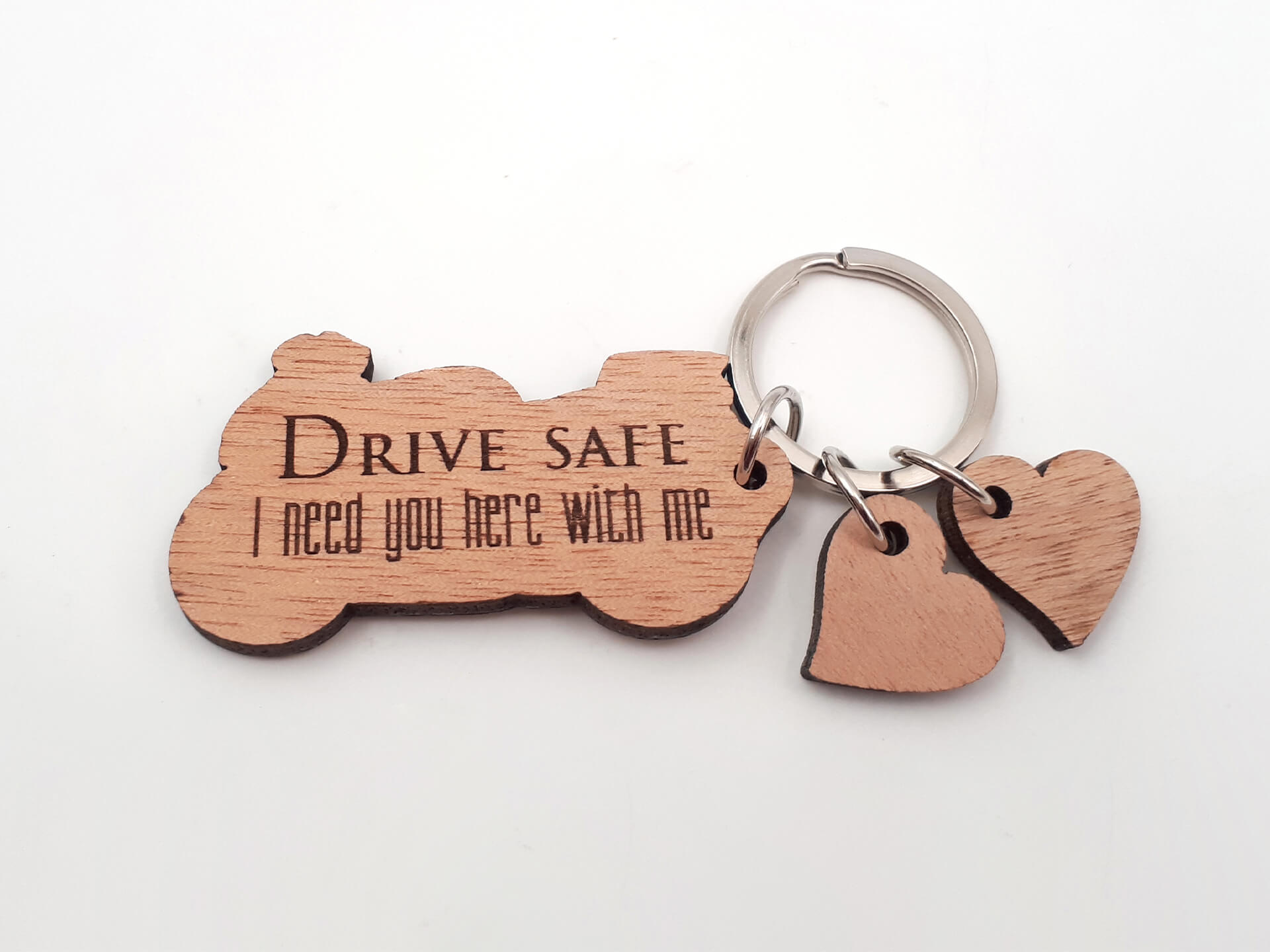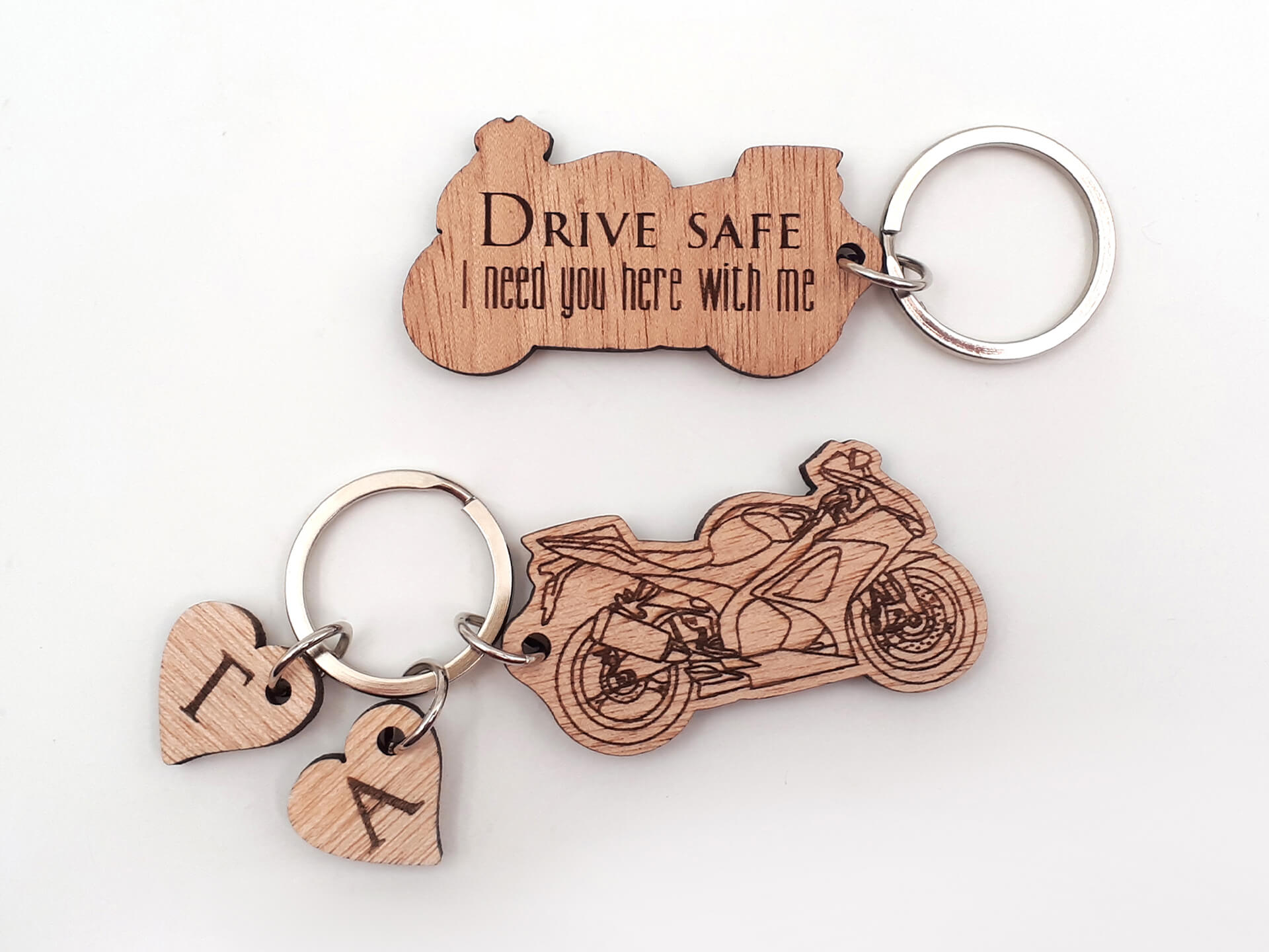 Πρωτότυπο ξύλινο μπρελόκ με χάραξη μοτοσυκλέτας και τη φράση Drive Safe. Ένα πρωτότυπο δώρο για τα αγαπημένα σας πρόσωπα.