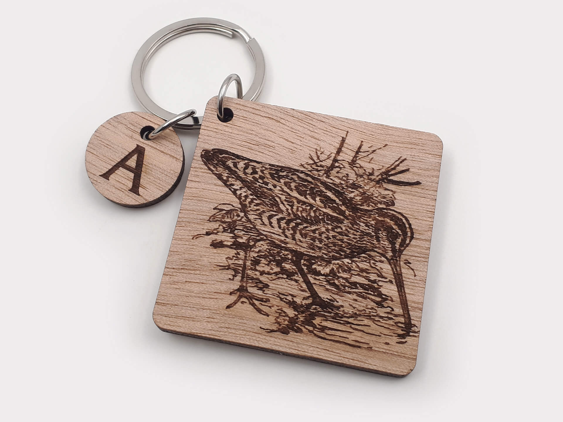 Ξύλινο μπρελόκ με χάραξη σχέδιο μπεκάτσας, ένα πρωτότυπο δώρο για τους λάτρεις του κυνηγιού.