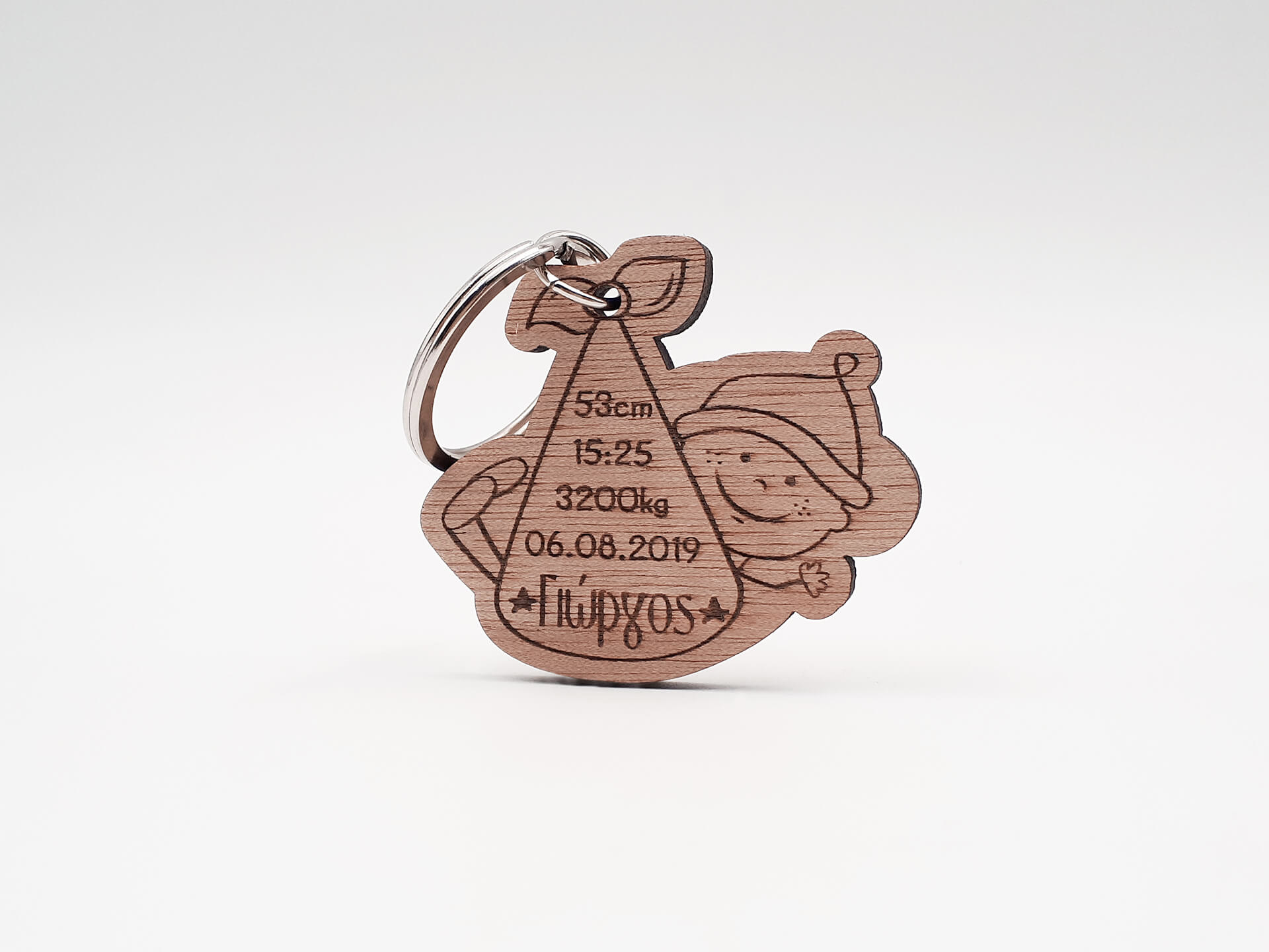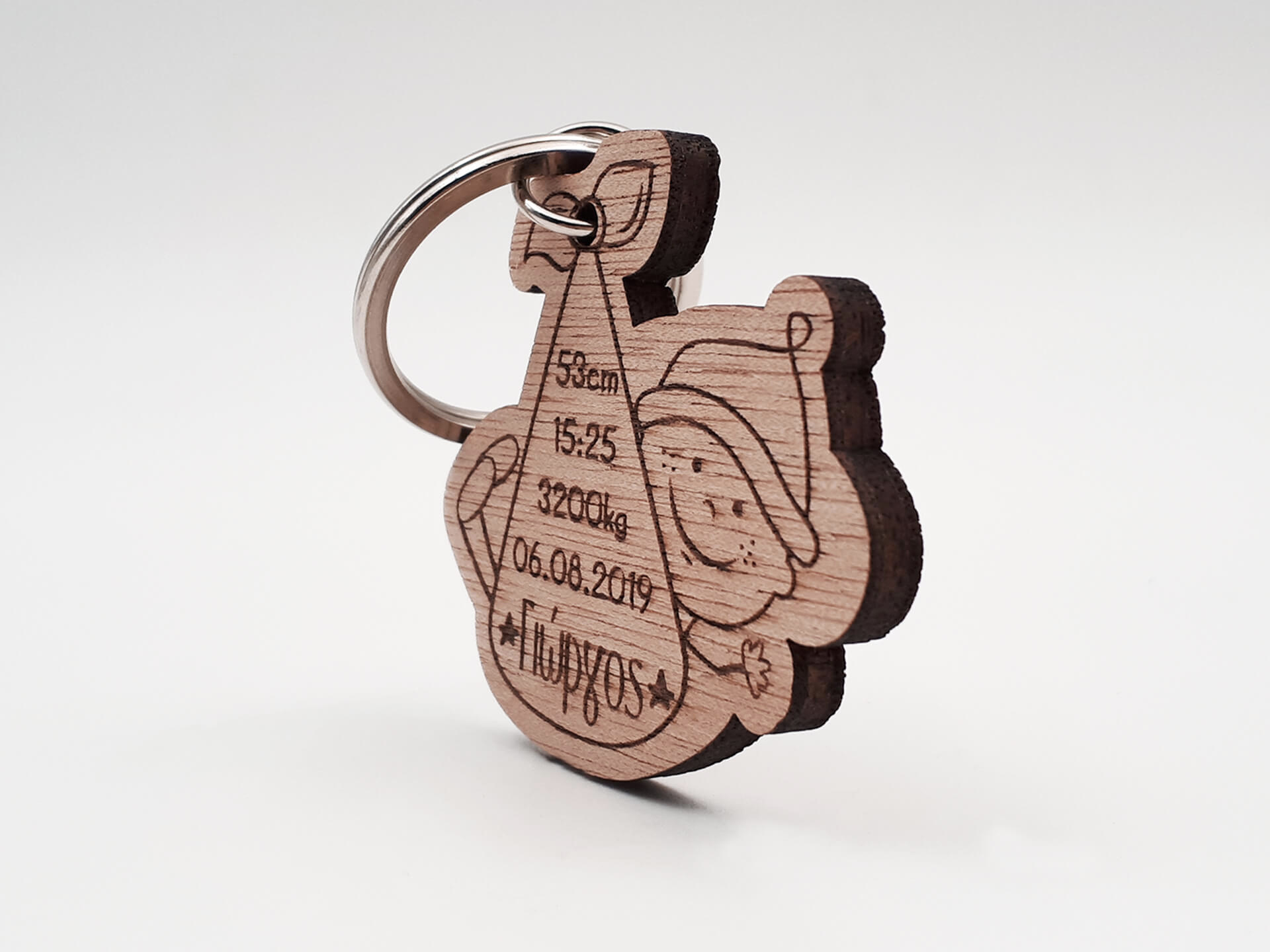 Ξύλινο μπρελόκ με το σάκο του πελαργού, για να σηματοδοτήσετε την άφιξη του νέου μέλους στην οικογένεια! Ένα πρωτότυπο σχέδιο για να χαράξετε το όνομα και την ημερομηνία γέννησης του μωρού σας και να τα έχετε πάντα μαζί σας, ή μπορείτε να το κάνετε δώρο σε νέους γονείς με τον ερχομό του νέου μέλους!