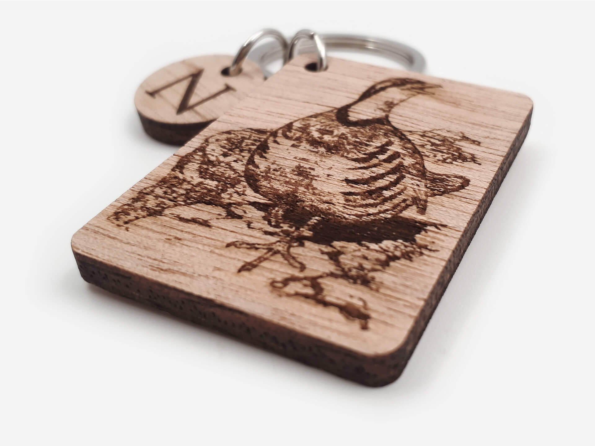 Ξύλινο μπρελόκ με χάραξη σχέδιο πέρδικας, ένα πρωτότυπο δώρο για τους λάτρεις του κυνηγιού.