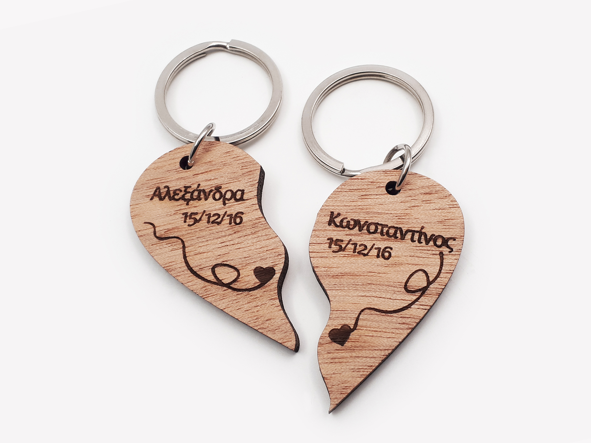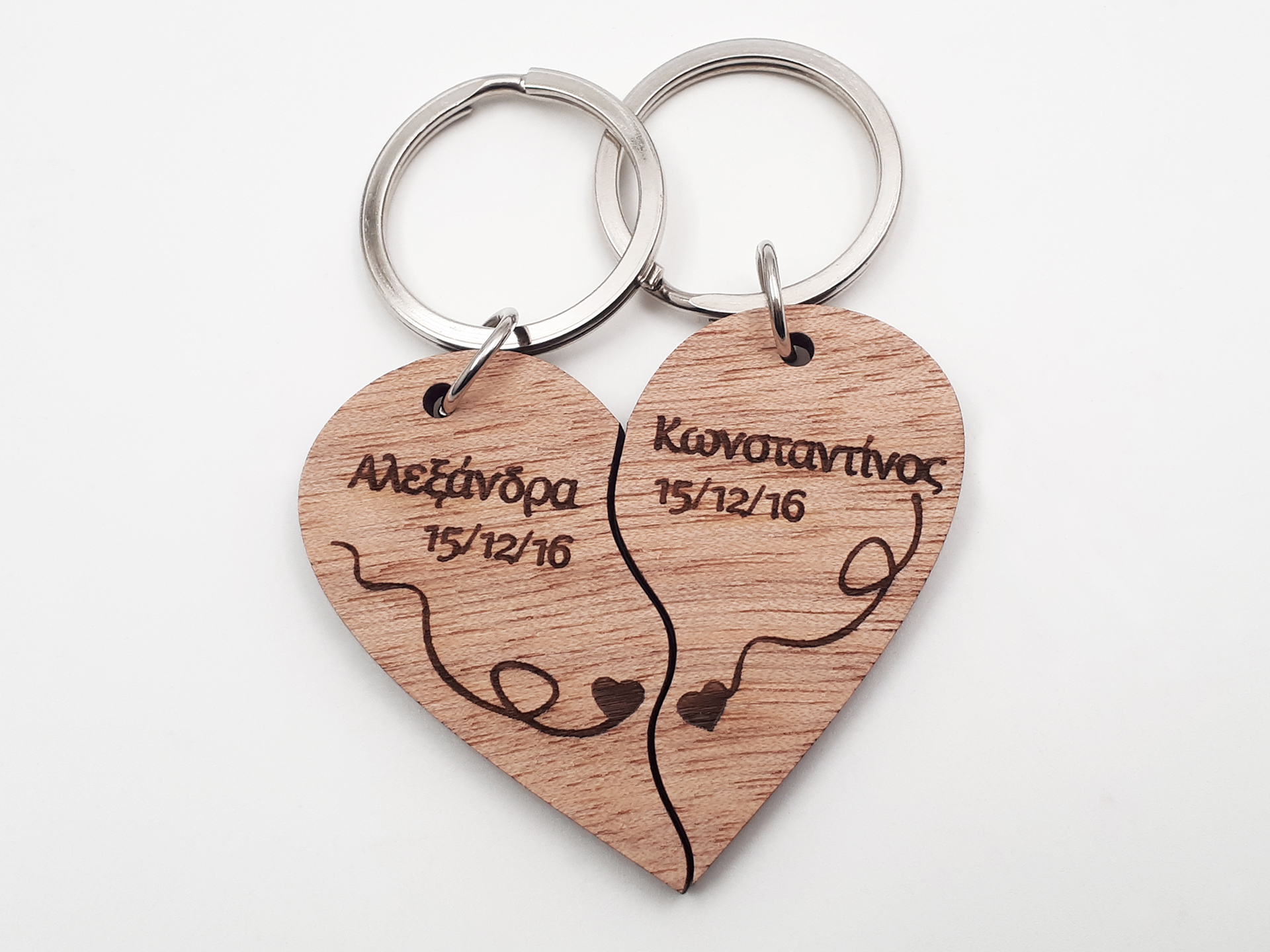 Διπλό Ξύλινο Μπρελόκ Παζλ σε σχήμα καρδιάς για εσάς και το αγαπημένο σας πρόσωπο με χάραξη των δικών σας ονομάτων και ημερομηνίας.
