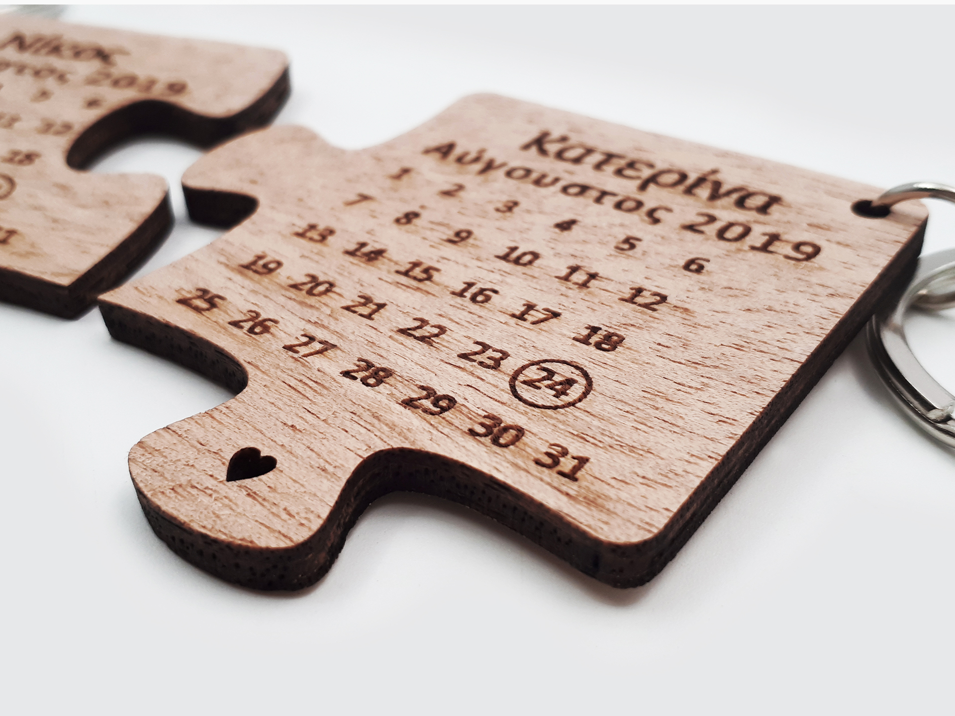 Πρωτότυπο διπλό ξύλινο μπρελόκ Παζλ για εσάς και το αγαπημένο σας πρόσωπο με χάραξη των δικών σας ονομάτων και ημερομηνίας.