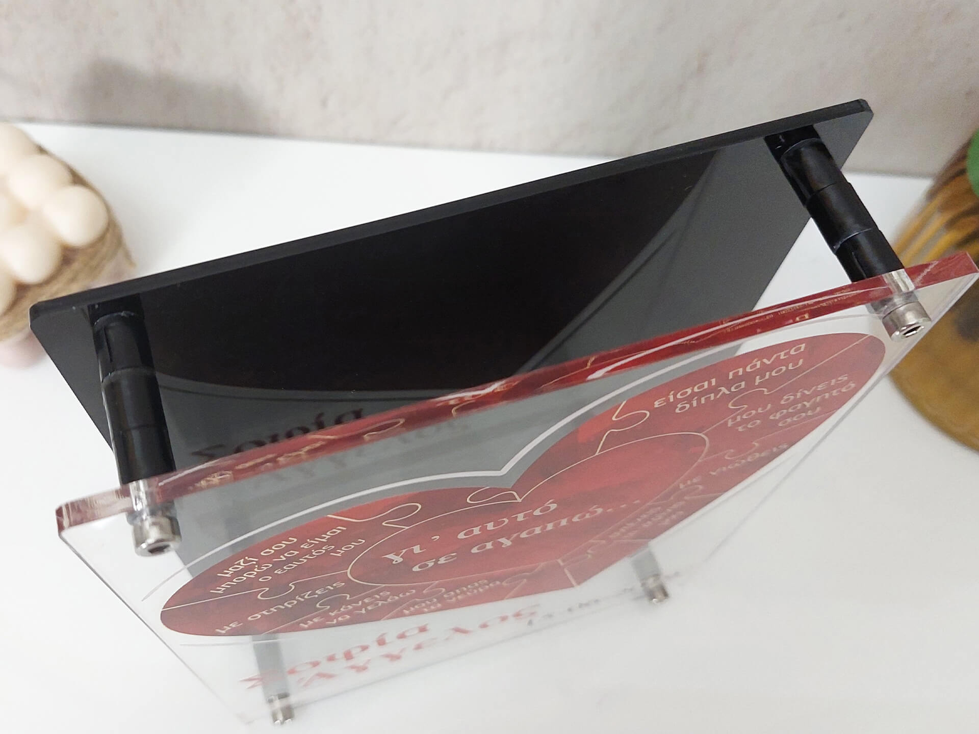 • Υλικά: Διάφανο ακρυλικό πάχους 4mm, Μαύρο ακρυλικό πάχους 3mm