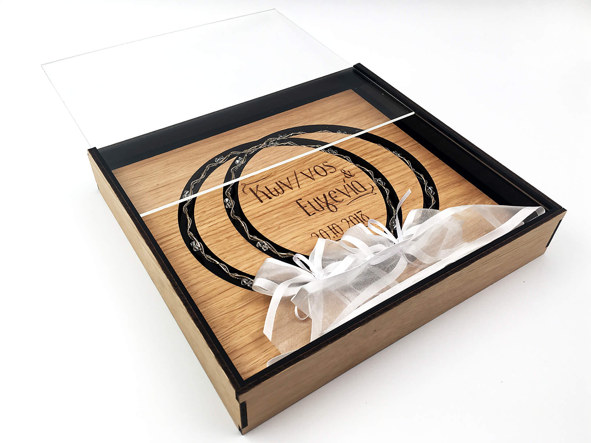 • Υλικά: Ακρυλικό μαύρο πάχους 3mm, Ξύλο MDF Δρυς πάχους 4mm, Ακρυλικό διάφανο πάχους 3mm