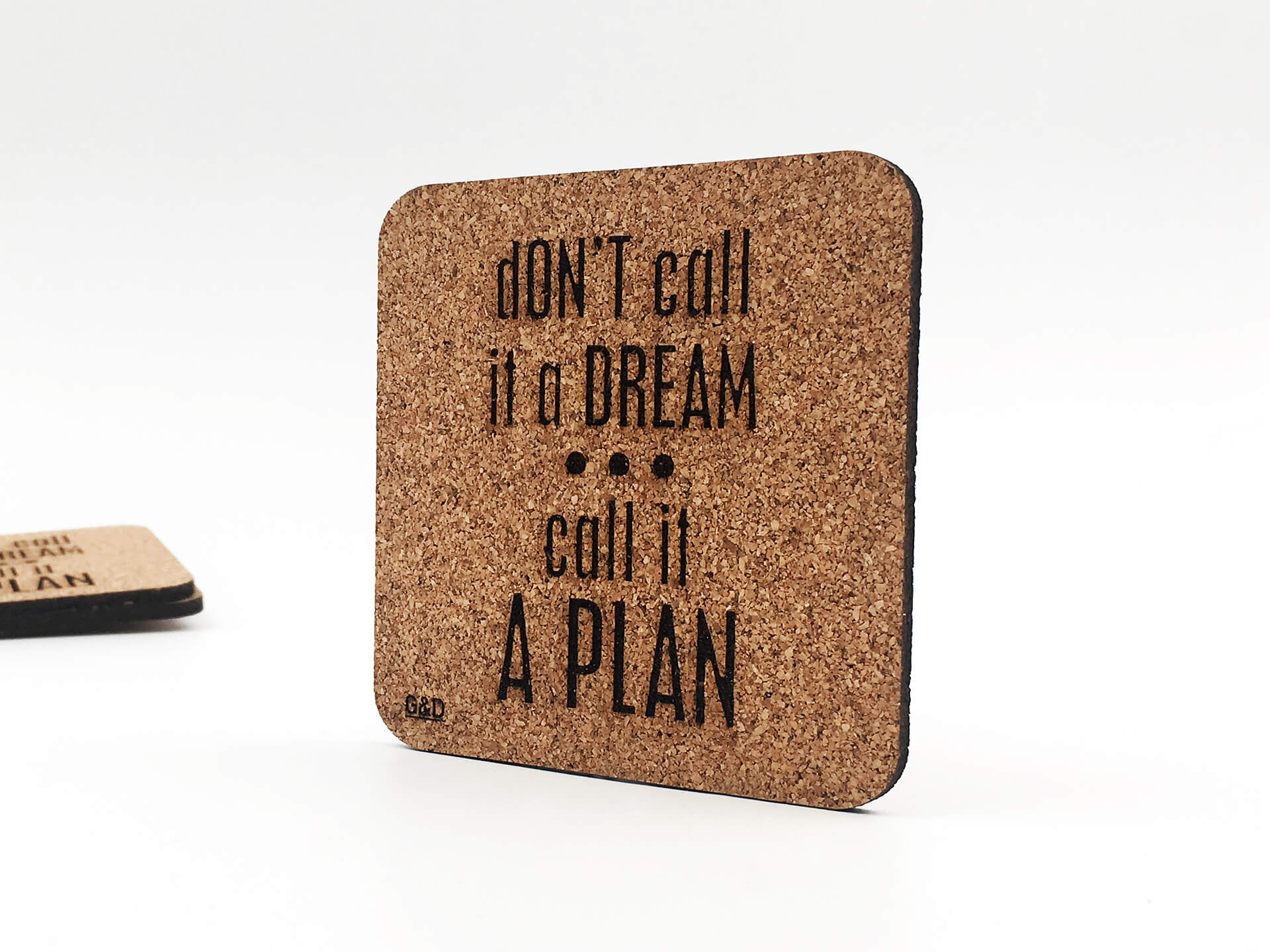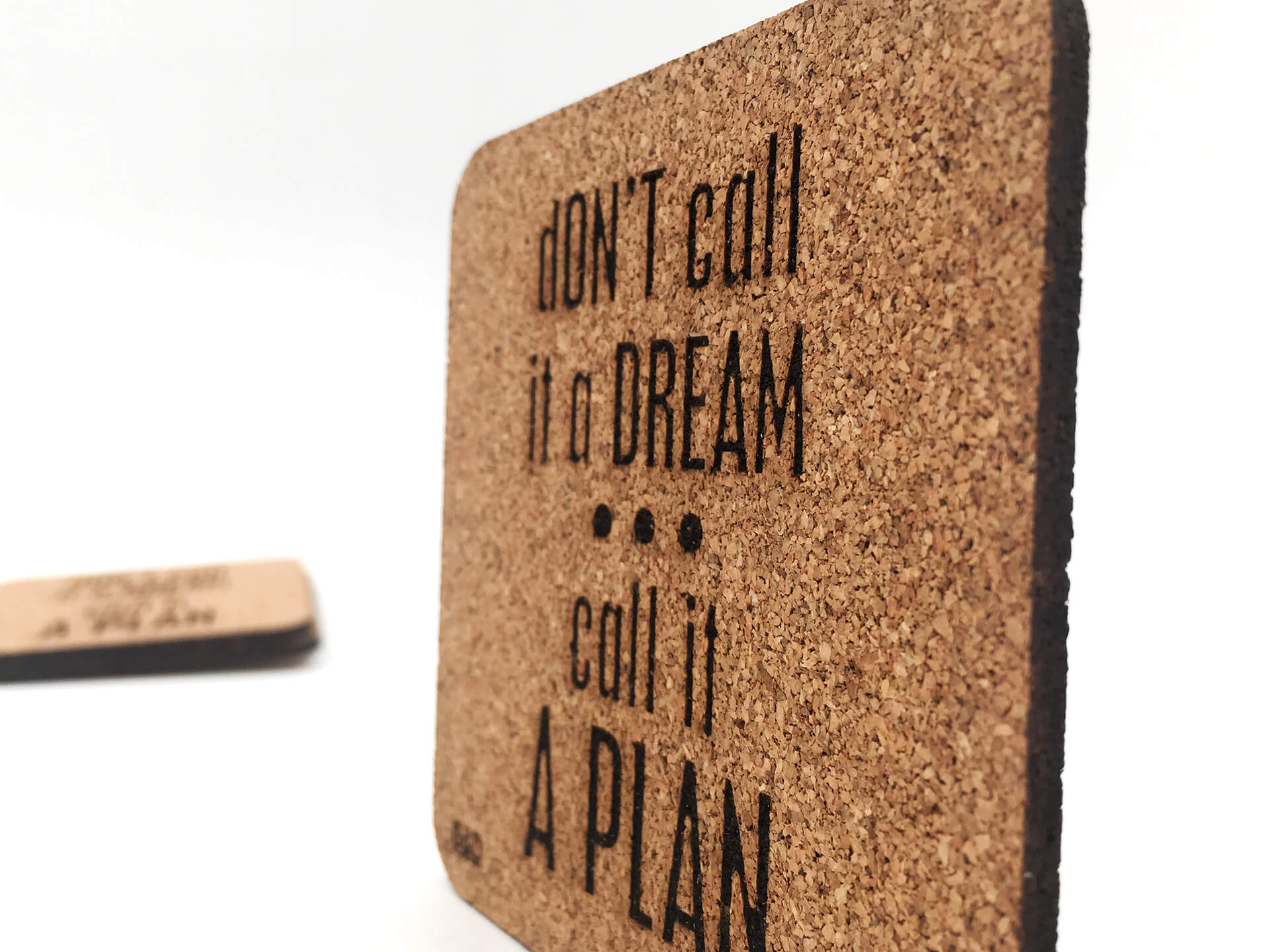 Πρωτότυπο σουβέρ από φελλό με χάραξη τη φράση ''don't call it a DREAM call it A PLAN''.