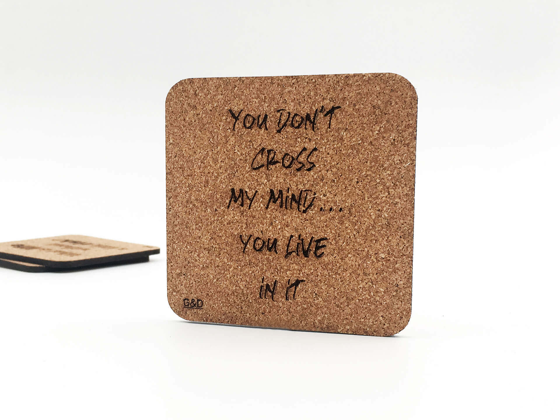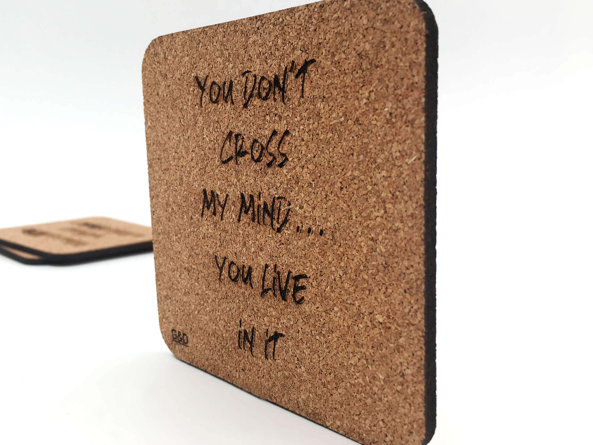 Πρωτότυπο σουβέρ από φελλό με χάραξη τη φράση ''YOU DON'T CROSS MY MIND...YOU LIVE IN IT''.
