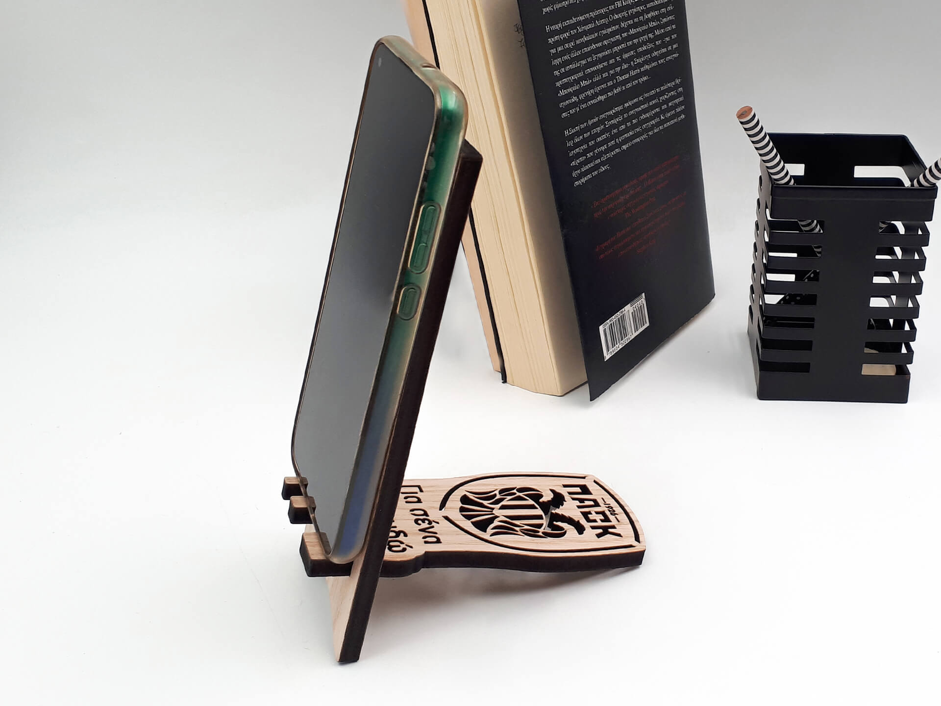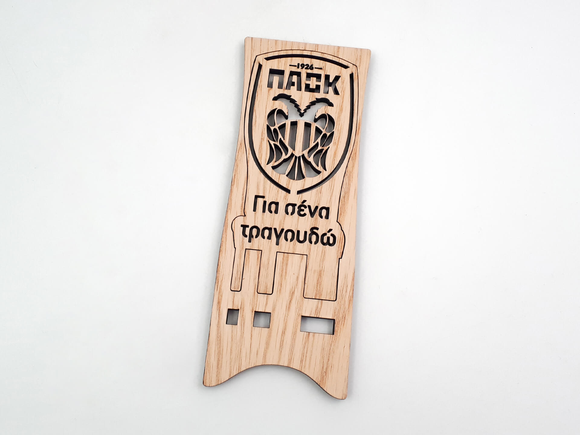 Ξύλινη βάση προβολής ΠΑΟΚ για την εύκολη λειτουργία του κινητού σας. Πρωτότυπος αναδιπλώμενος σχεδιασμός για να την έχετε παντού μαζί σας.