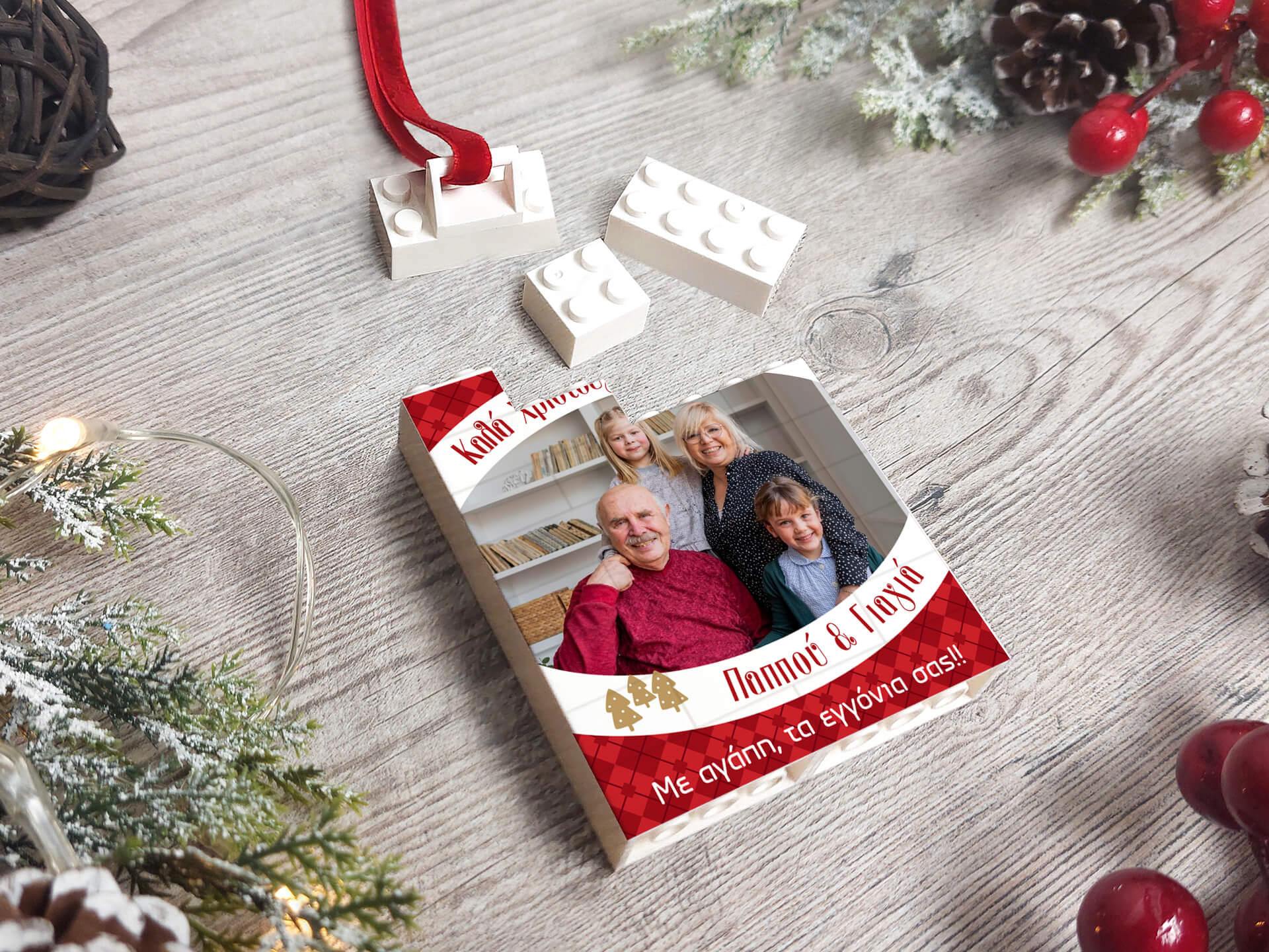 • Υλικά: Τουβλάκια τύπου lego, δεμένο με κόκκινη κορδέλα