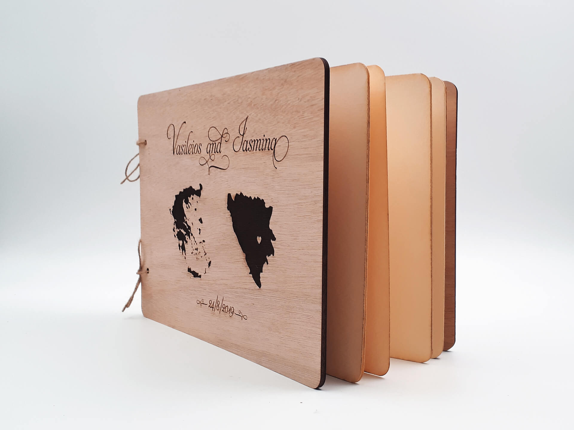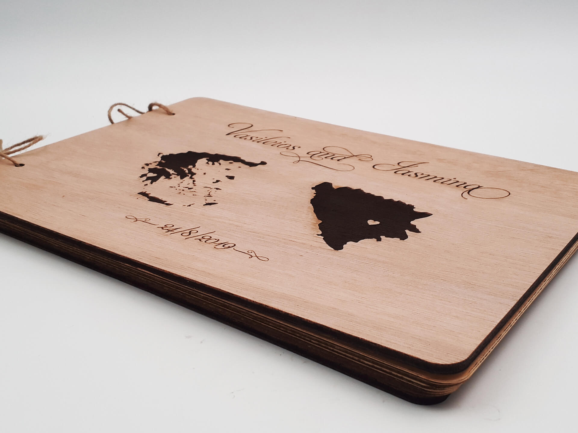 Πρωτότυπο ξύλινο βιβλίο ευχών για γάμο με χάραξη.