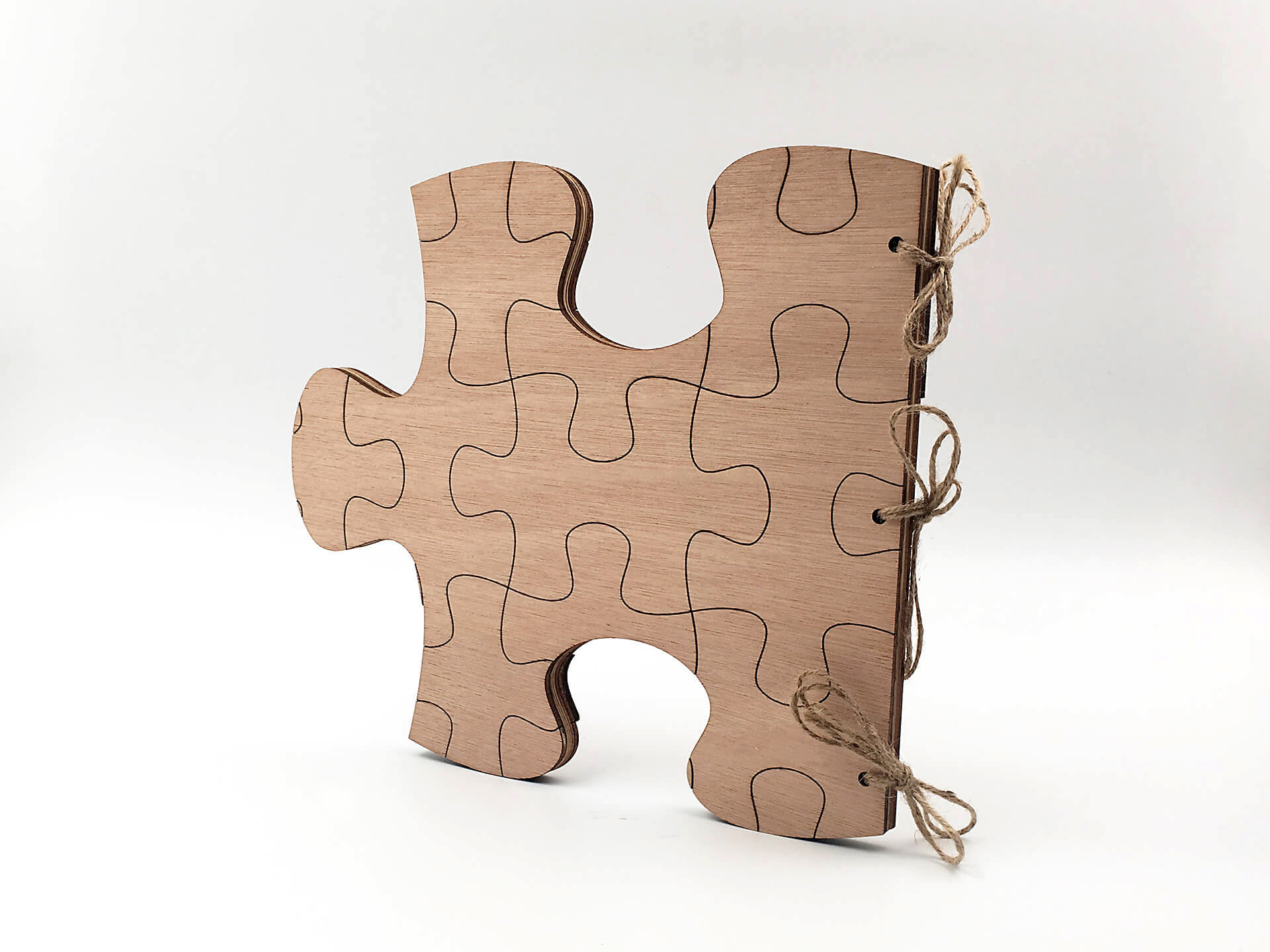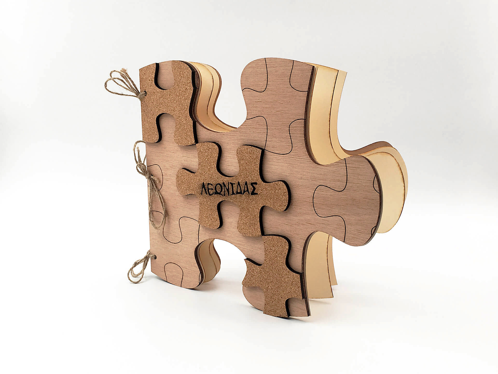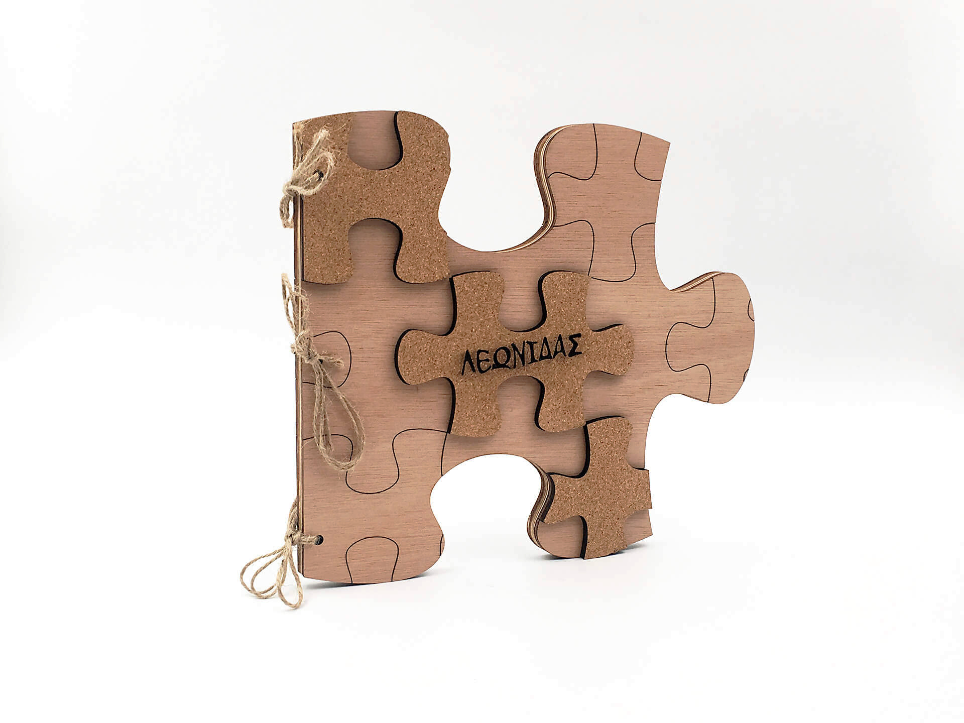 Πρωτότυπο βιβλίο ευχών από ξύλο και φελλό, σε σχήμα πάζλ.
