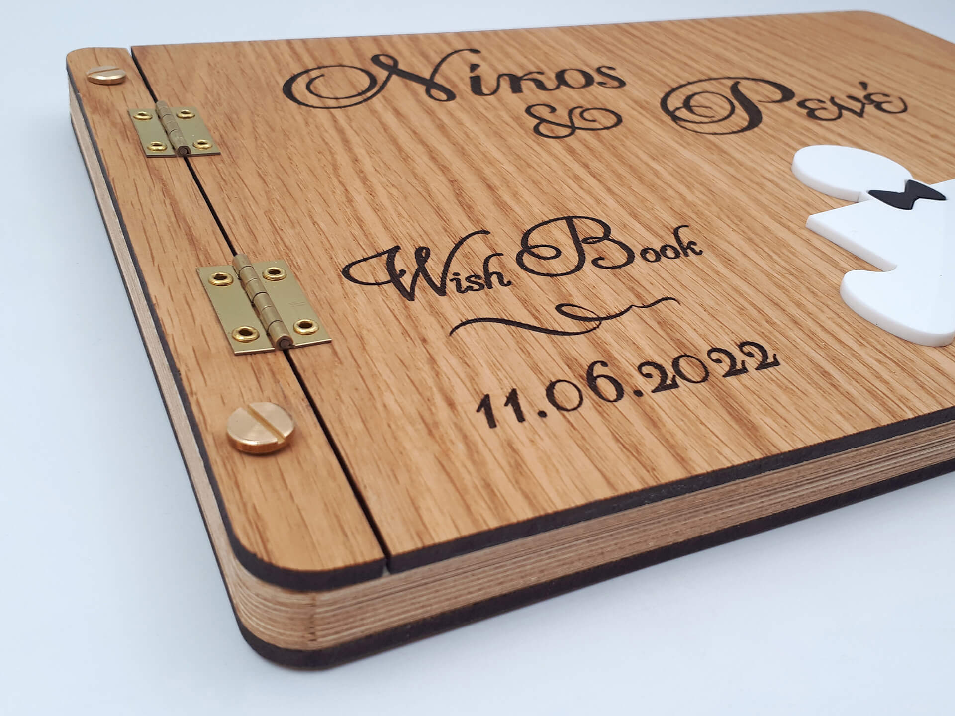 • Υλικά: Εξώφυλλο και οπισθόφυλλο από ξύλο δρυς πάχους 4mm, Λεπτομέρειες από λευκό και μαύρο ακρυλικό πάχους 3mm, Ακρυλικό(plexiglass) καθρέπτης χρυσός πάχους 3mm
