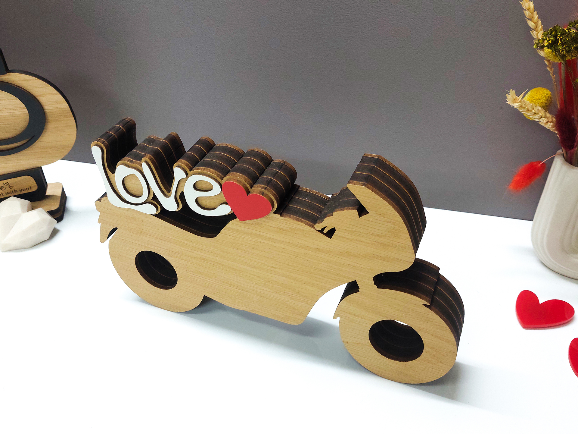 • Υλικά: Ξύλο Δρυς πάχους 4mm, ξύλο γυμνό πάχους 10mm, ξύλο λευκό πάχους 3mm, κόκκινη λεπτομέρεια από χρωματισμένο ξύλο πάχους 4mm