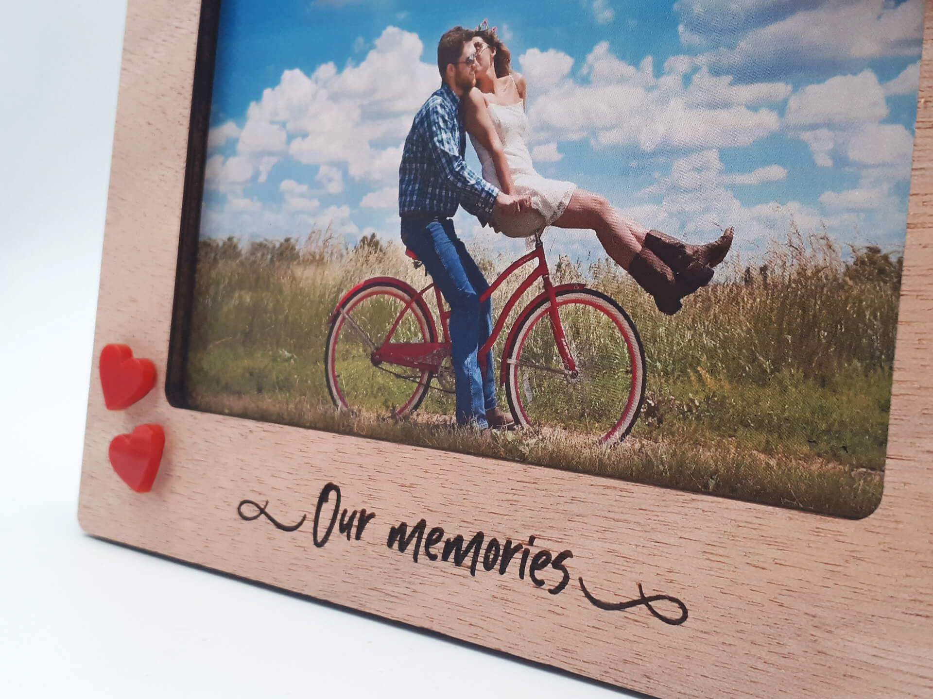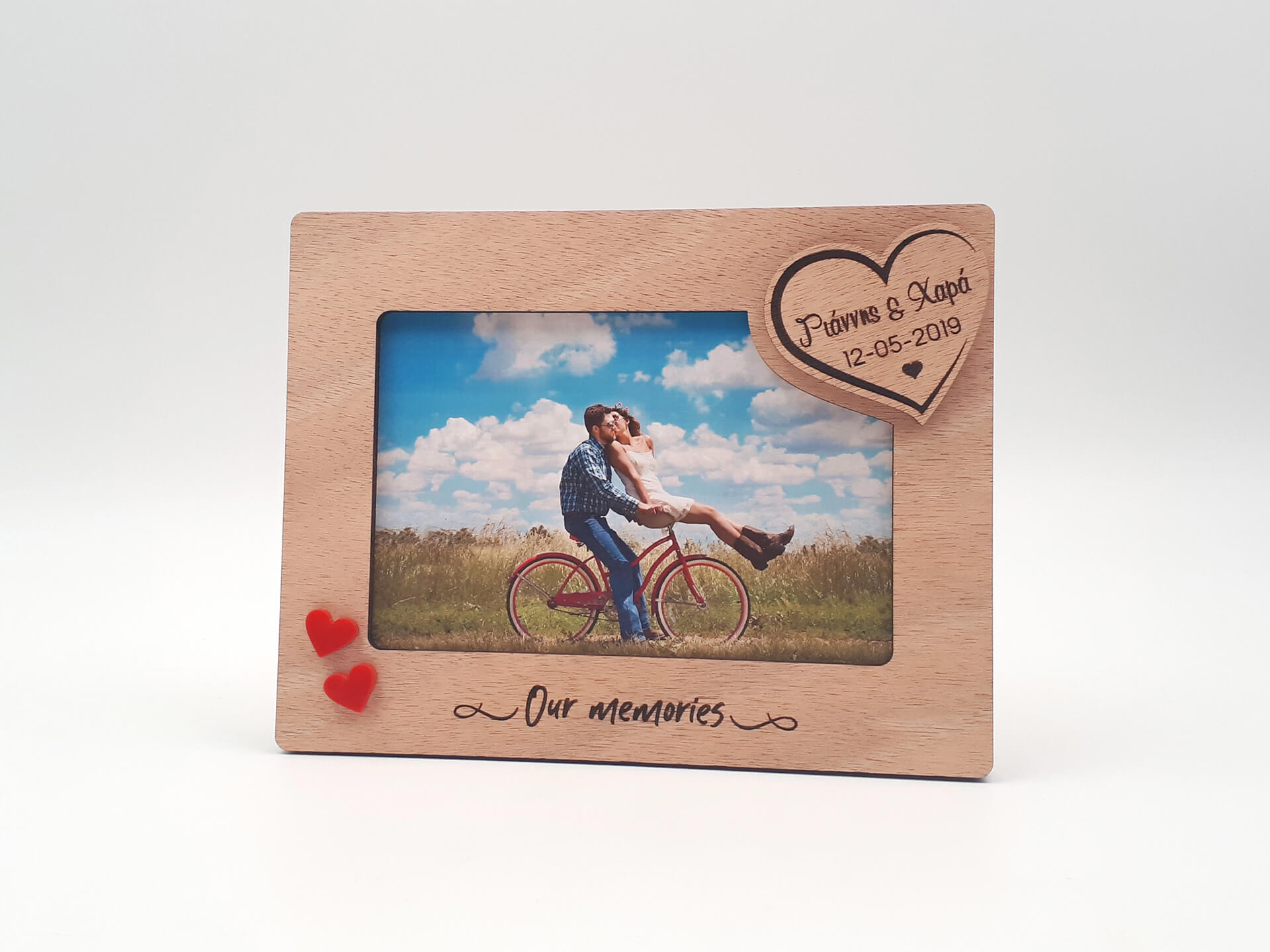 Επιτραπέζια κορνίζα στη φυσική απόχρωση του ξύλου με κόκκινες λεπτομέρειες. Κρατήστε για πάντα τις αναμνήσεις σας σε μια ιδιαίτερη κορνίζα ή δωρίστε την στο αγαπημένο σας πρόσωπο.