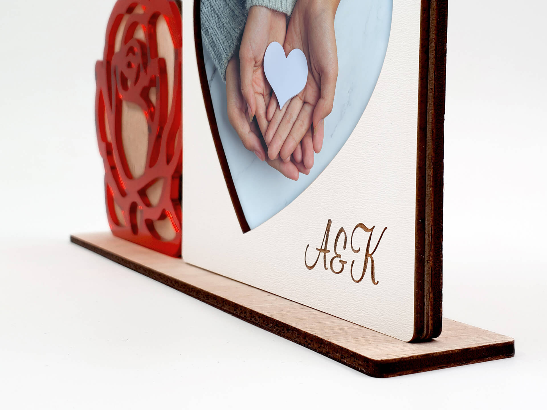 Επιλέξτε ένα ιδιαίτερο προσωποποιημένο δώρο για το άλλο σας μισό και εντυπωσιάστε! Επιτραπέζια ξύλινη κορνίζα Rose με κόκκινες και χρυσές λεπτομέρειες!