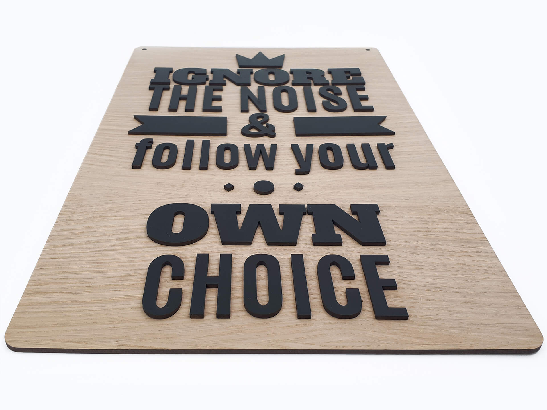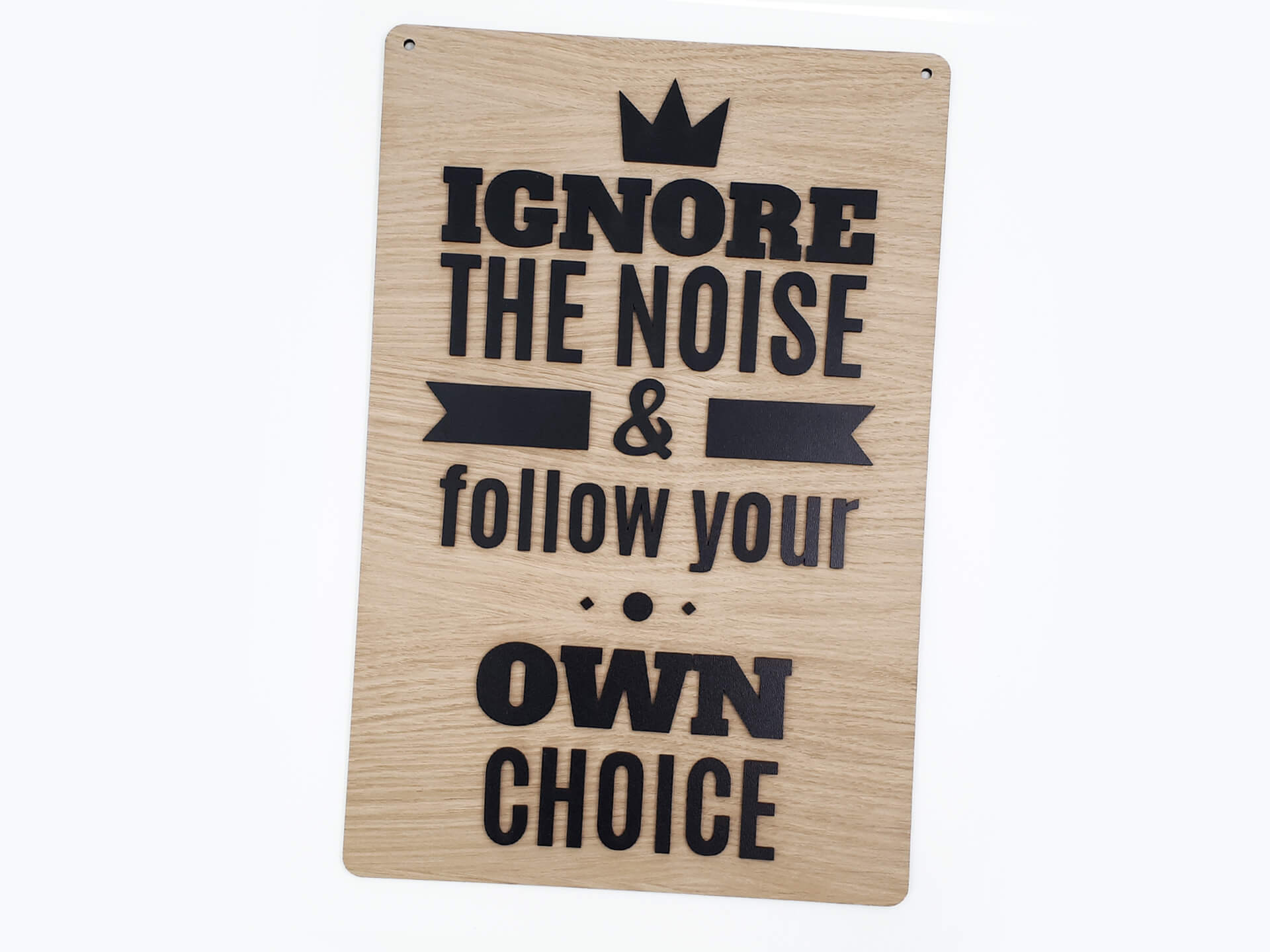 Ιδιαίτερη ξύλινη ταμπέλα για τη διακόσμηση του χώρου σας με θέμα "Own choice Quote", με διπλό υλικό στο κείμενο "Ignore the noise & follow your own choice". Ένα ακόμα πρωτότυπο δώρο για τα αγαπημένα σας πρόσωπα.