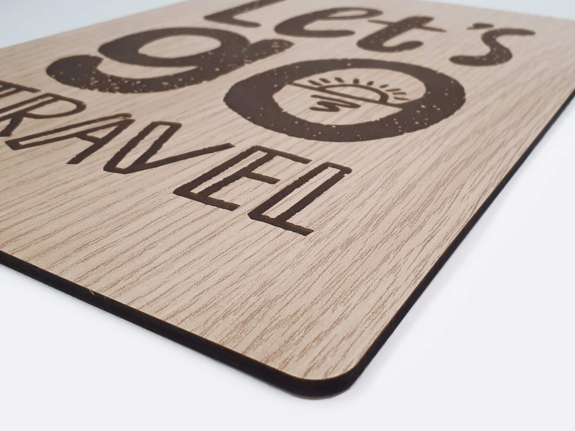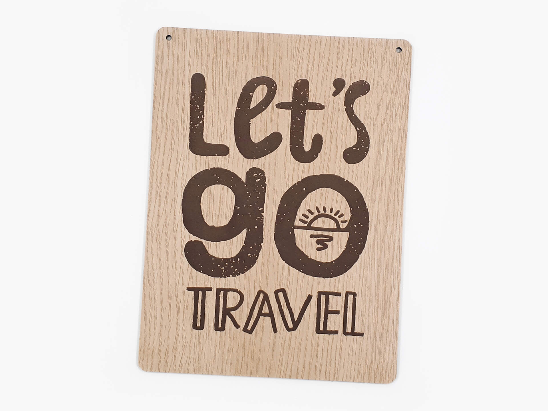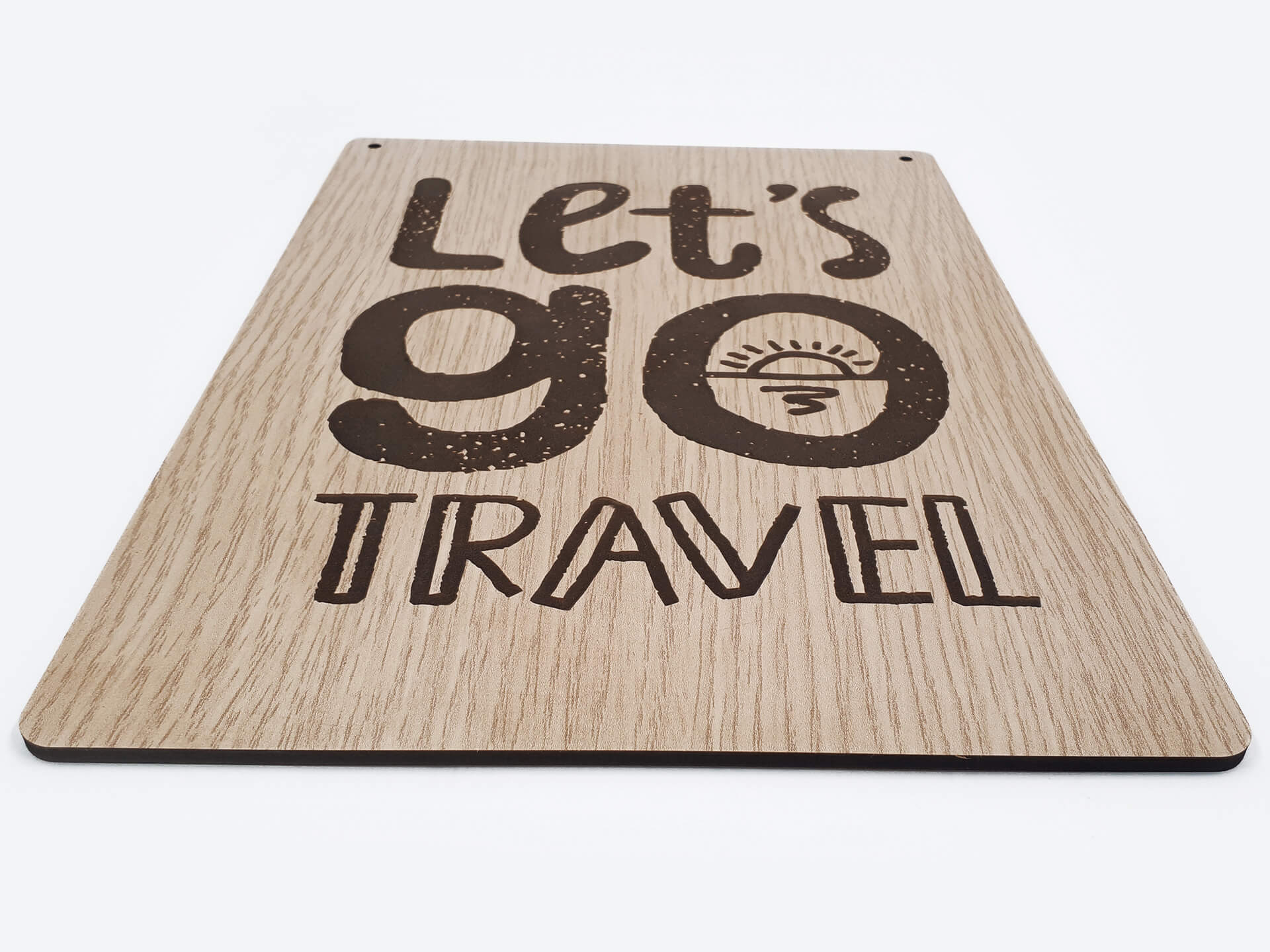 Ιδιαίτερη ξύλινη ταμπέλα για τη διακόσμηση του χώρου σας με θέμα "Travel Quote". Χάραξη κειμένου "Les's go travel". Ένα ακόμα πρωτότυπο δώρο για τους λάτρεις των ταξιδιών.