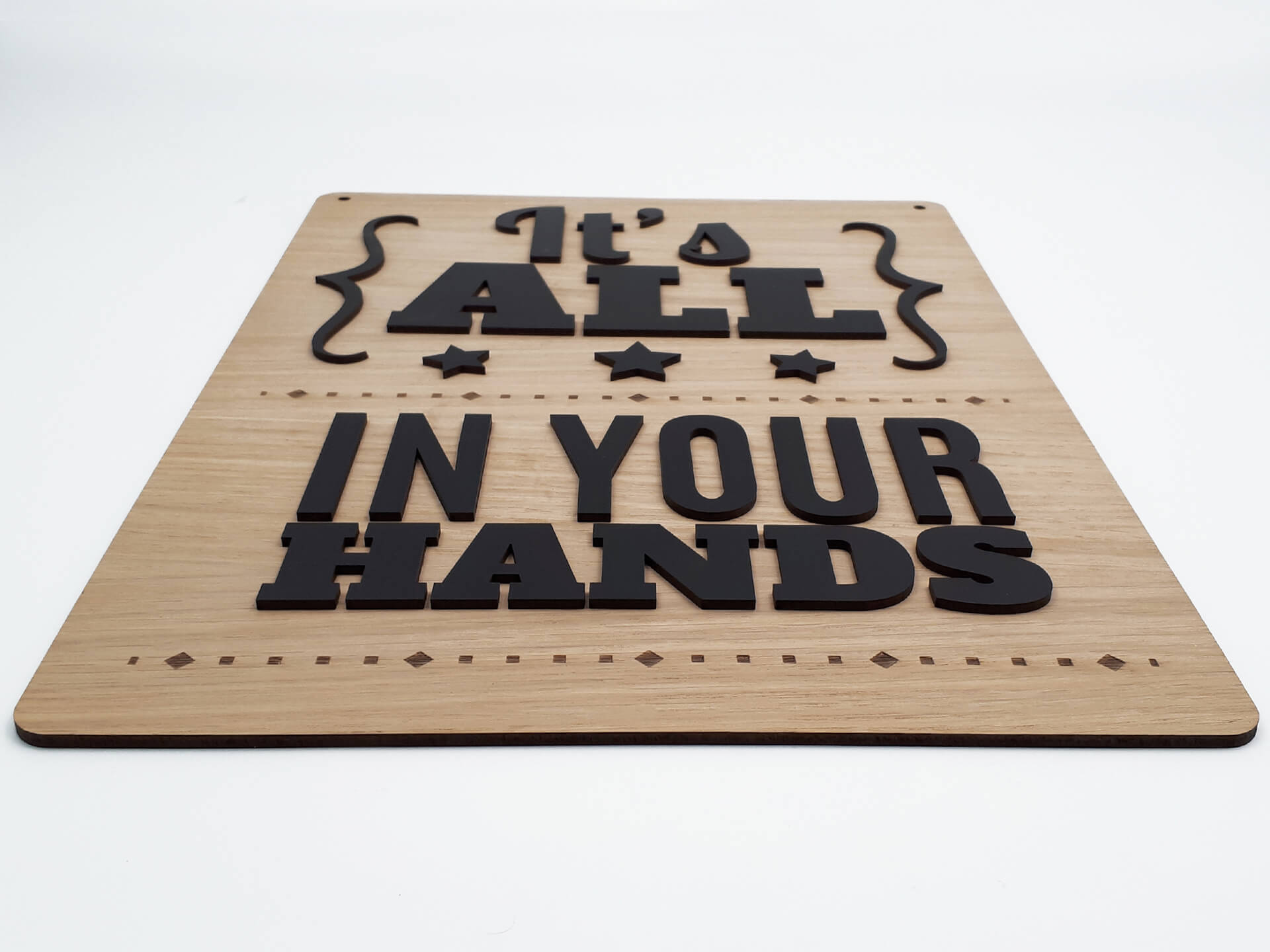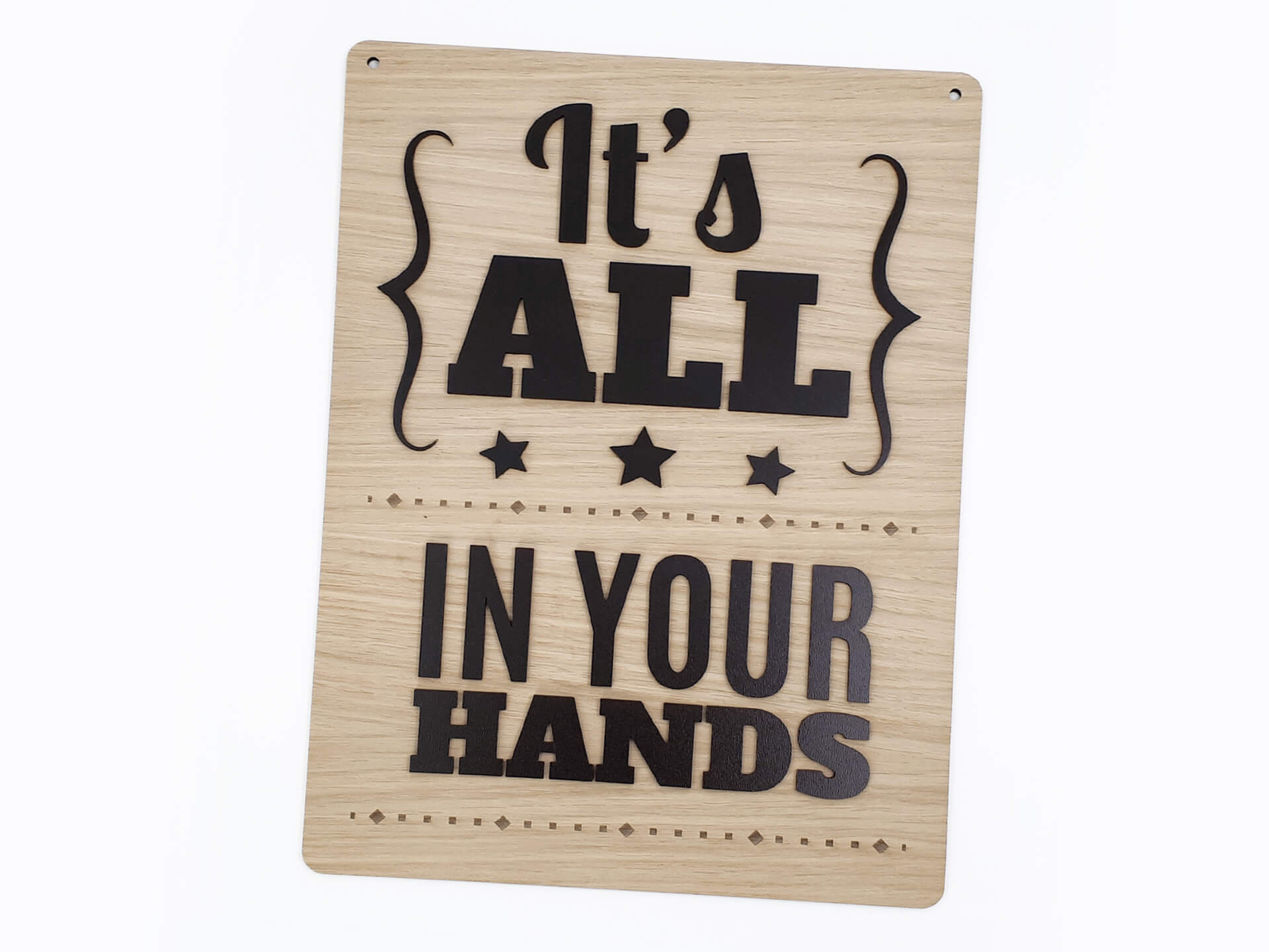 Ιδιαίτερη ξύλινη ταμπέλα για τη διακόσμηση του χώρου σας με θέμα "Try Quote", με διπλό υλικό στο κείμενο "It's all in your hands". Ένα ακόμα πρωτότυπο δώρο για τα αγαπημένα σας πρόσωπα.