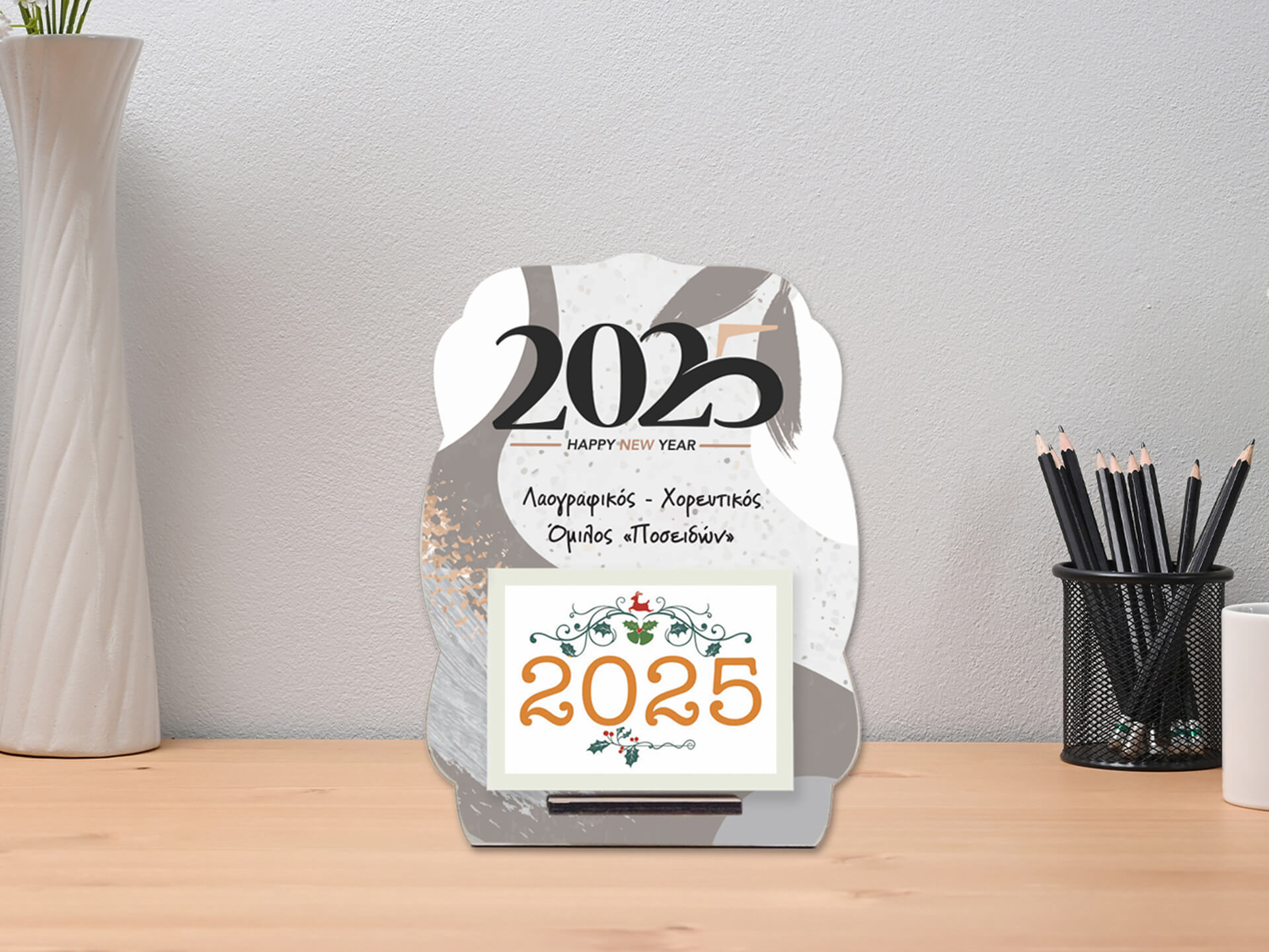 Ξύλινο επιτραπέζιο ημερολόγιο με δυνατότητα προσθήκης του δικού σας κειμένου για την επιχείρησή σας, το σύλλογο, ή το σχολείο σας!